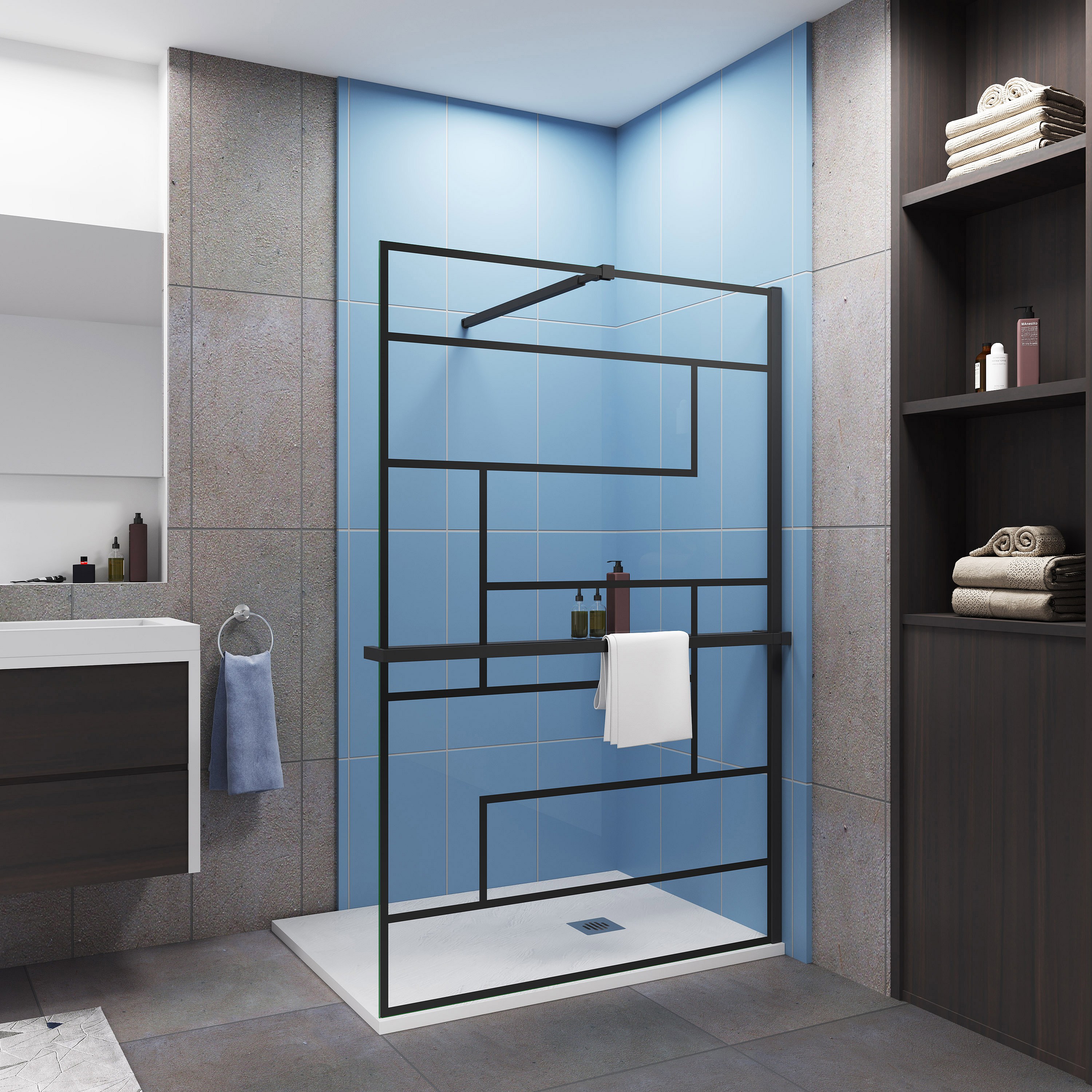 Paroi de douche fixe 140x200 cm + barre de fixation 140cm + Étagère de Douche 140cm en alu - verre 8 mm anticalcaire - Noir mat