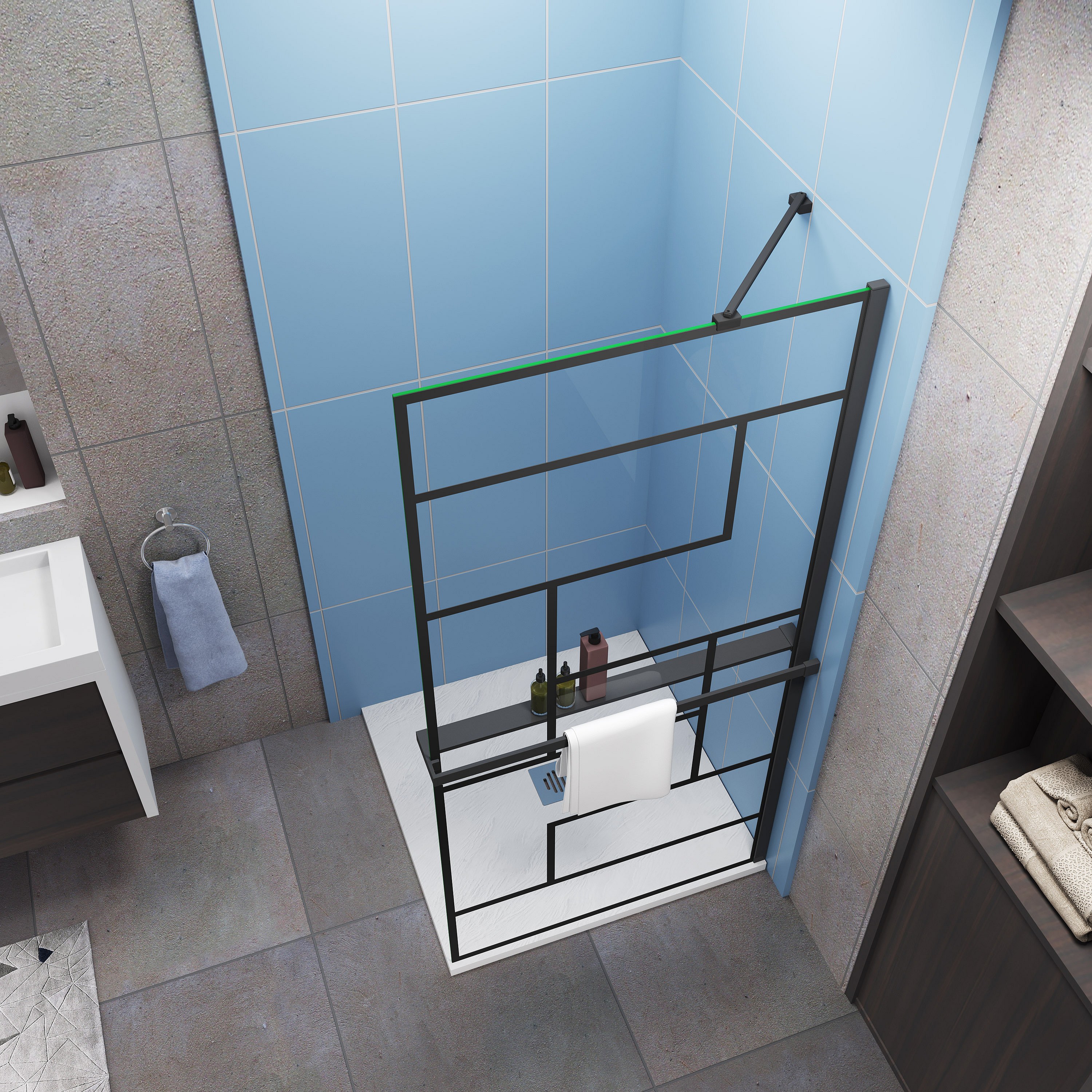 Paroi de douche 90x200cm style industriel + Étagère de Douche 90cm alu noir + 8mm verre anticalcaire + barre fixation 73-120cm