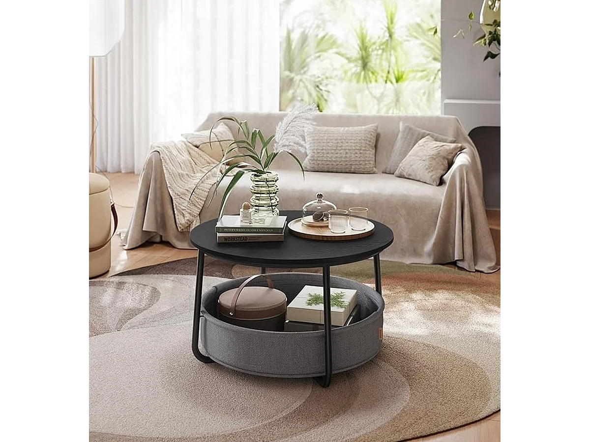 Parya Home table basse ronde, table d'appoint, table de salon avec panier en tissu, moderne, Noir-leige gris