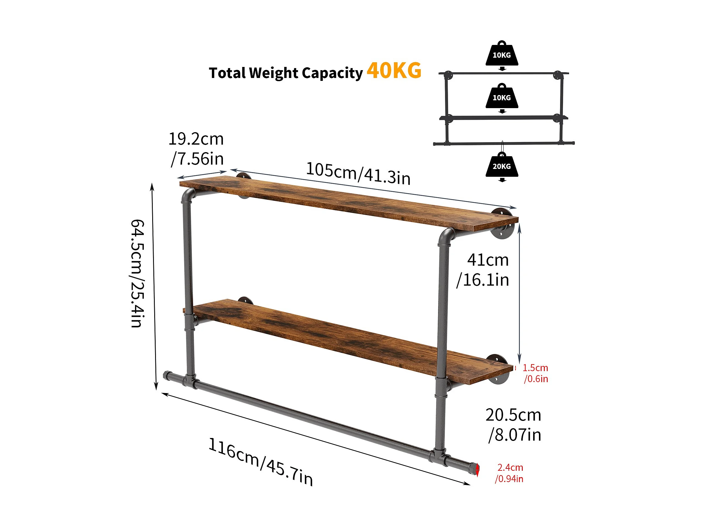 Penderie vêtement mural avec étagères portant vêtement suspendue tringle à vêtement design porte manteau 116x20.5x64.5cm