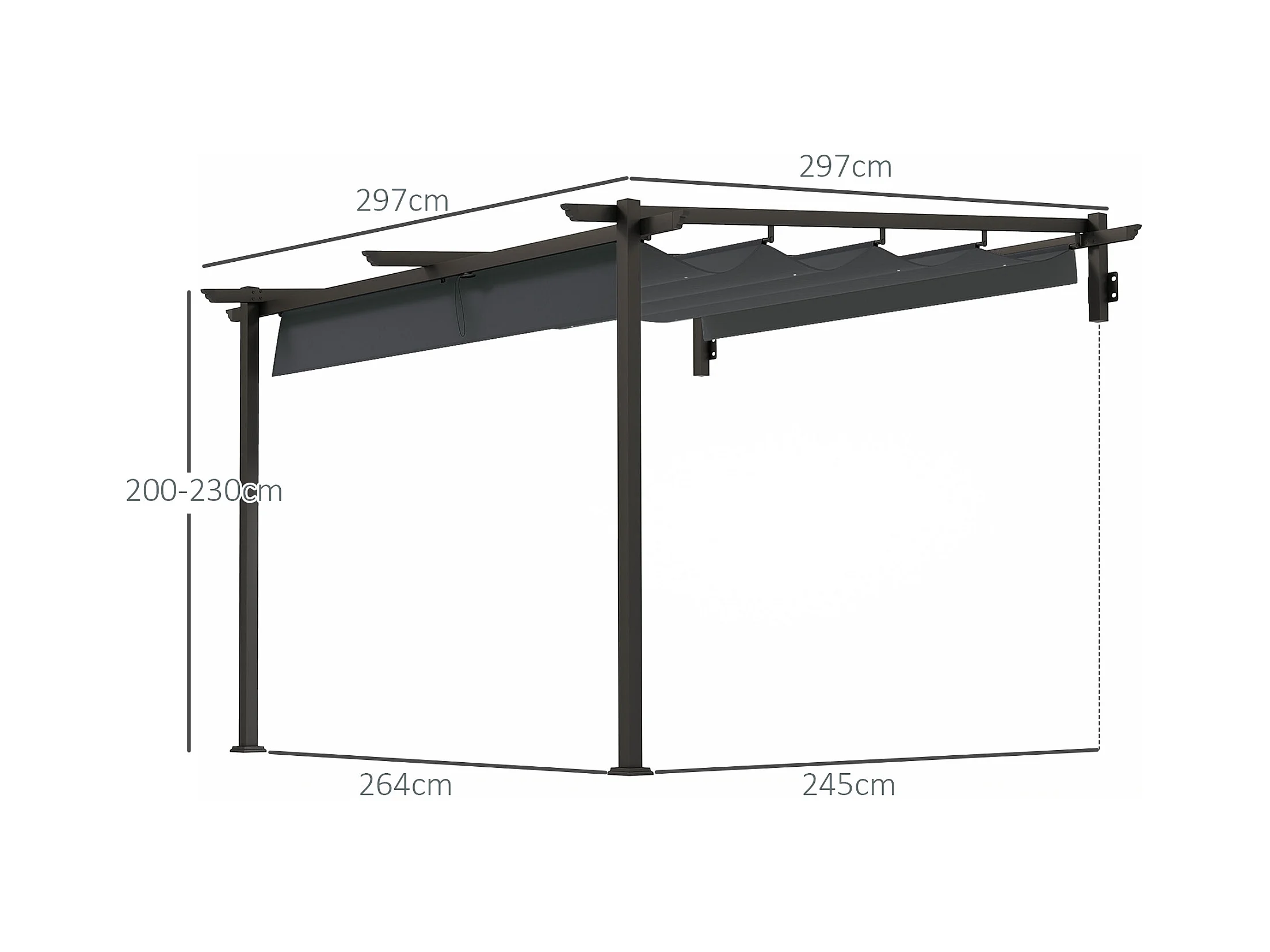 Pergola murale avec toit rétractable, structure acier et polyester, gris foncé (297x297x230cm)