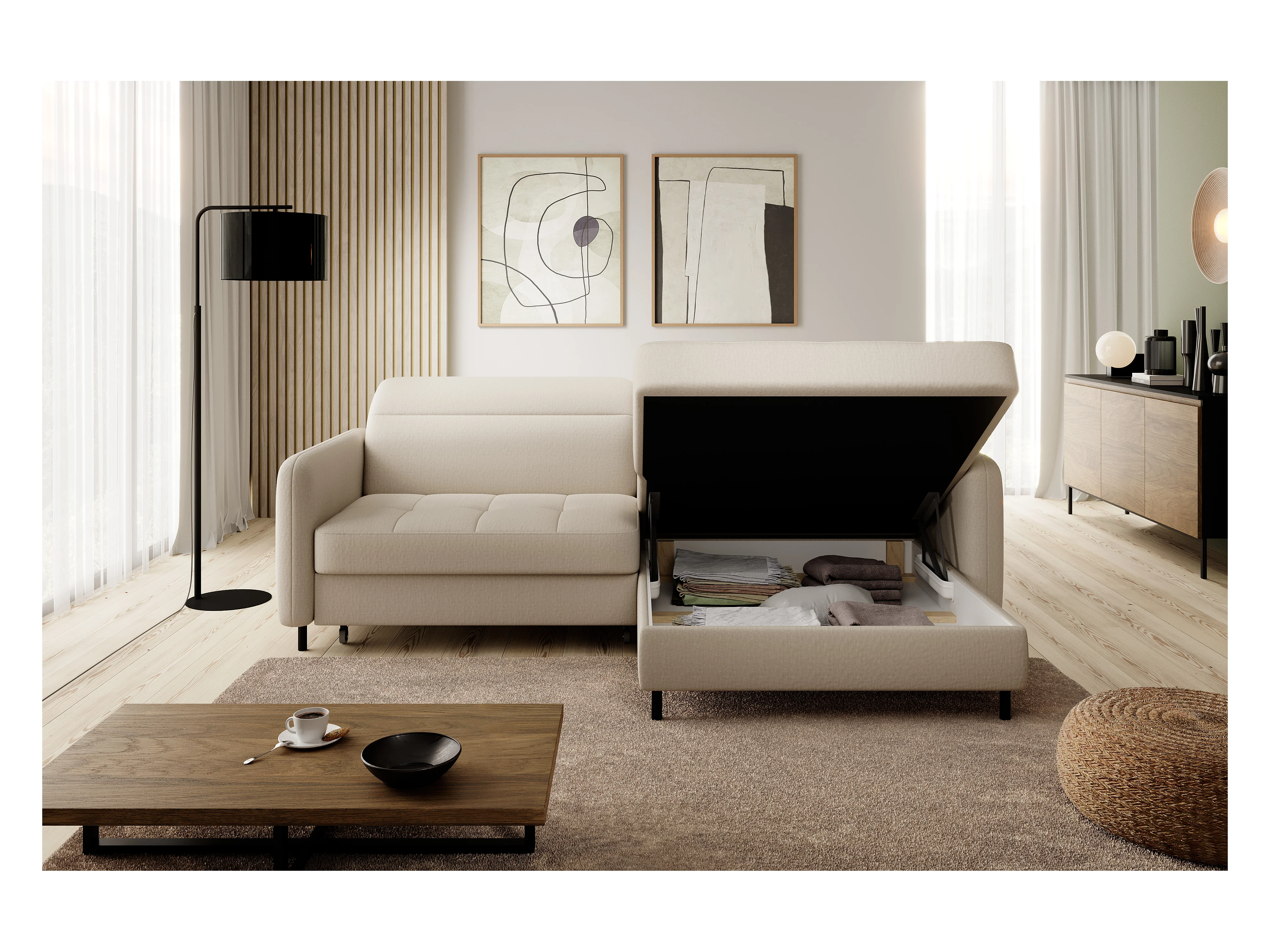 Petit canapé d'angle en tissu convertible avec coffre Takin 206cm-Beige-angle gauche