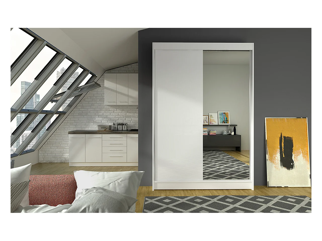 Petite armoire design de chambre à coucher 2 portes coulissantes blanche et miroir Kinzo 120cm