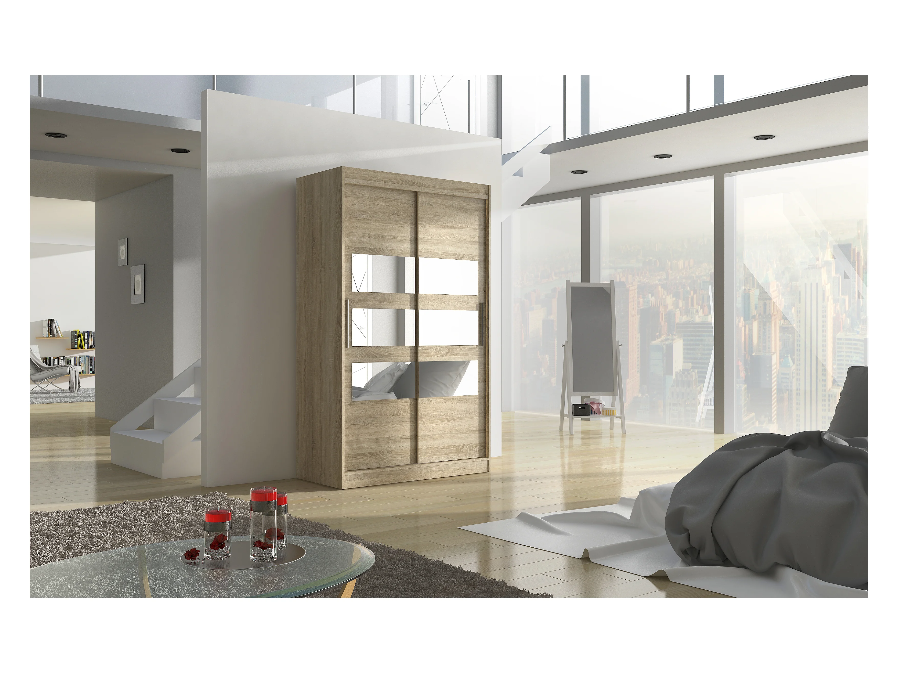 Petite armoire design de chambre à coucher 2 portes coulissantes naturel et miroir Kinzo 120cm