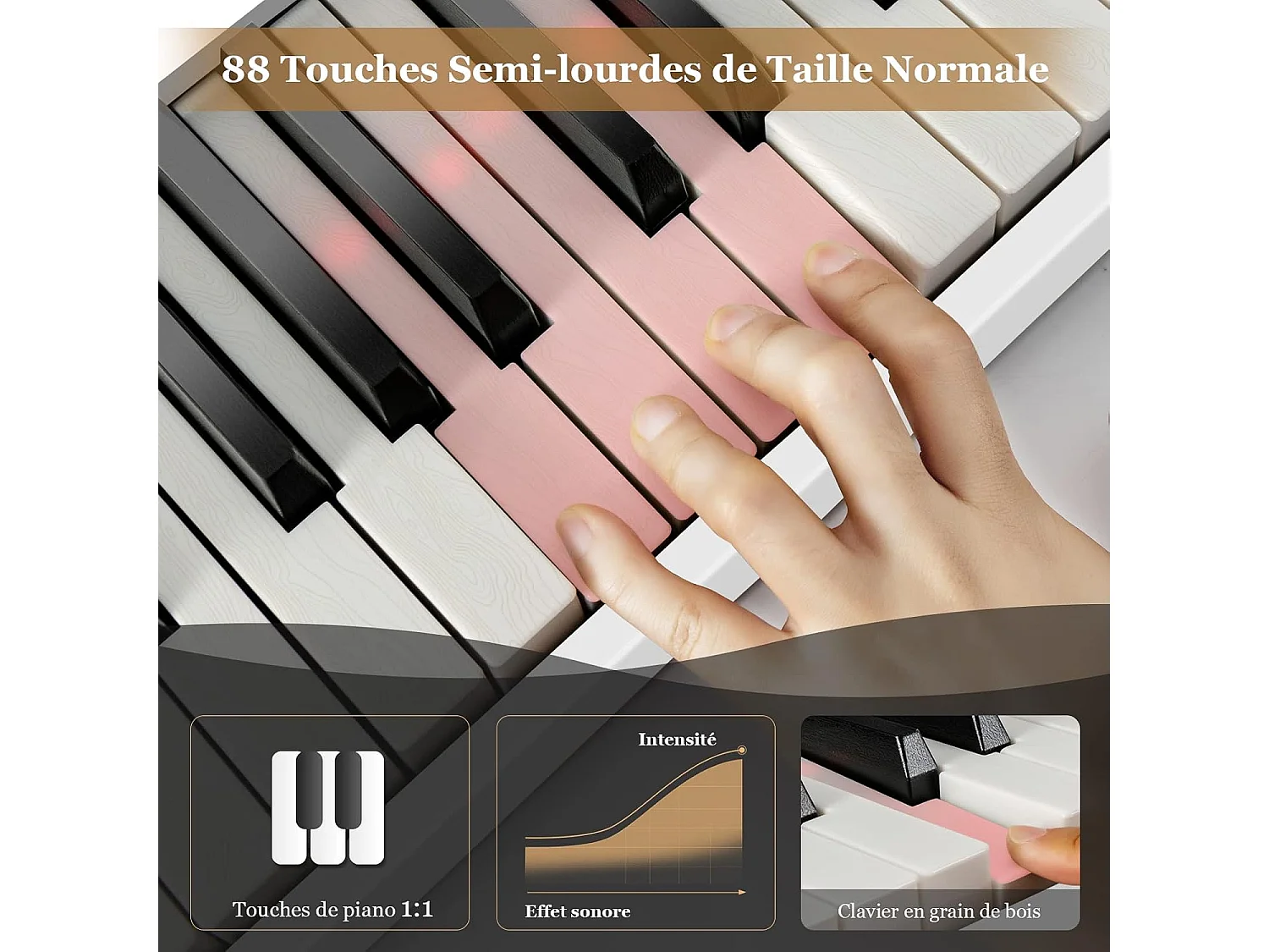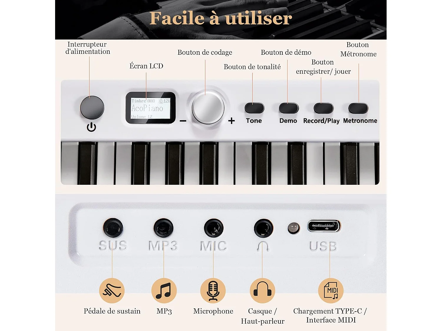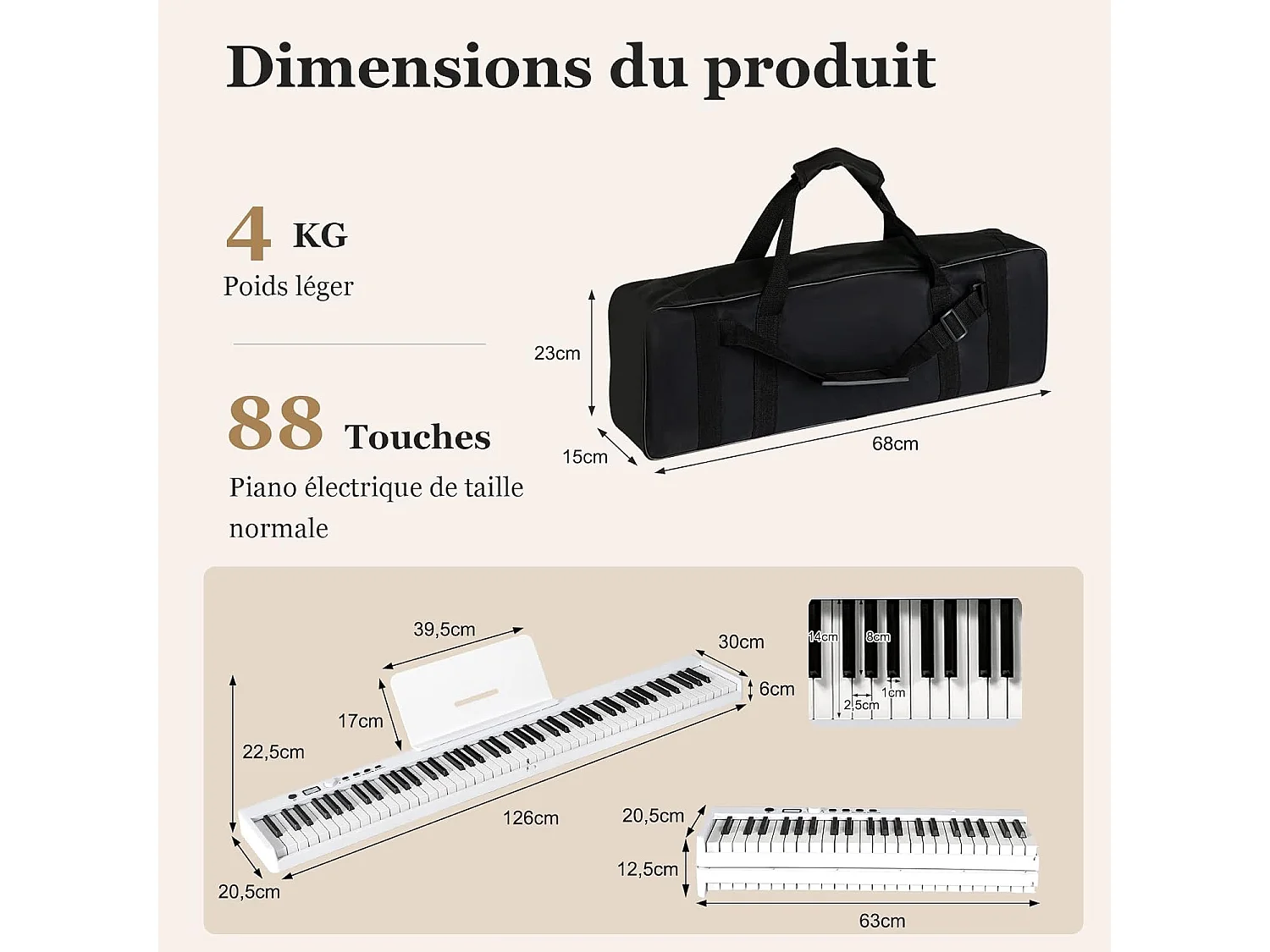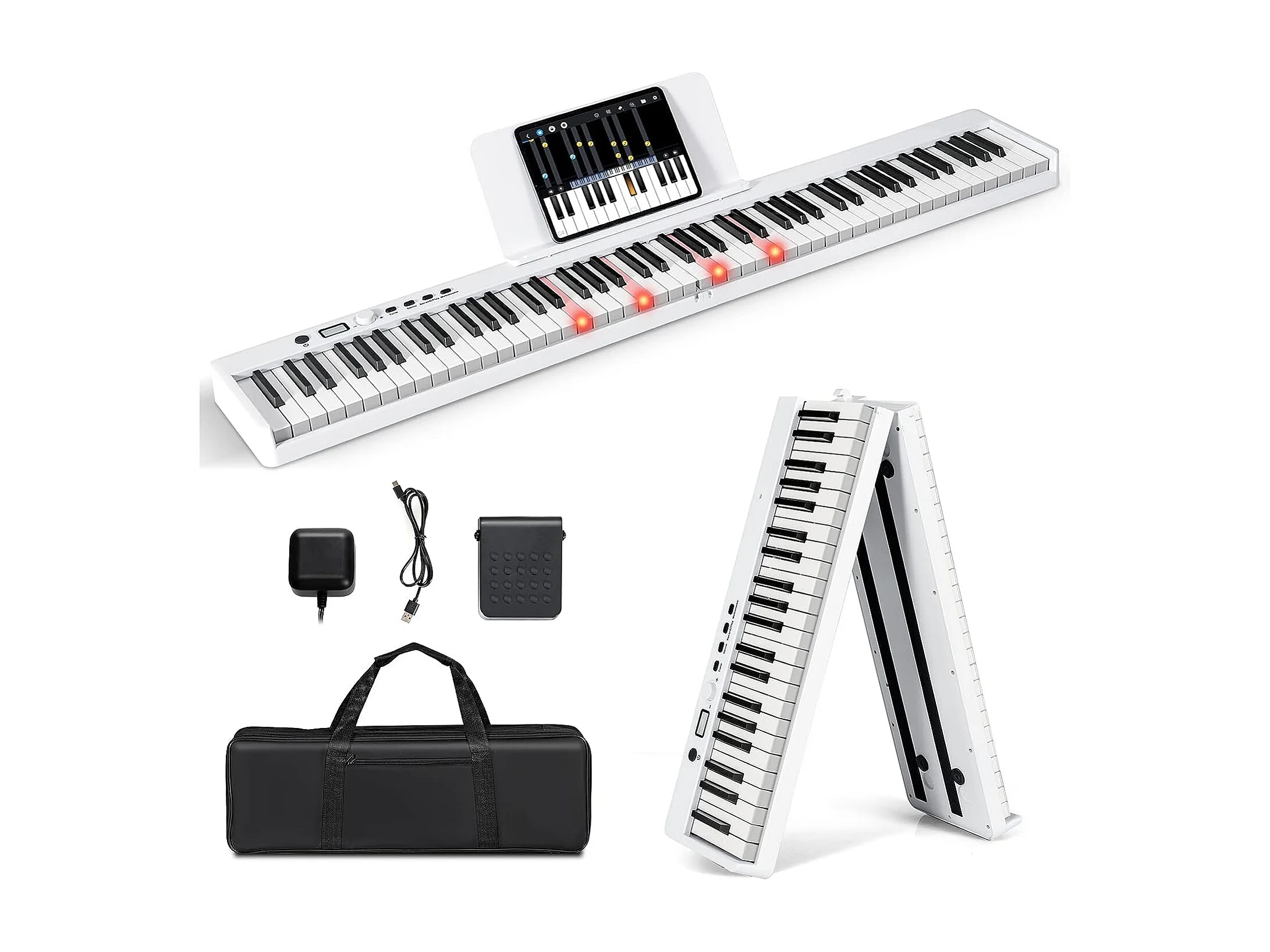 Piano Numérique Pliable à 88 Touches avec Pupitre, 2 Modes d'Apprentissage, MP3/USB/MIDI 126x20,5x6cm, Blanc