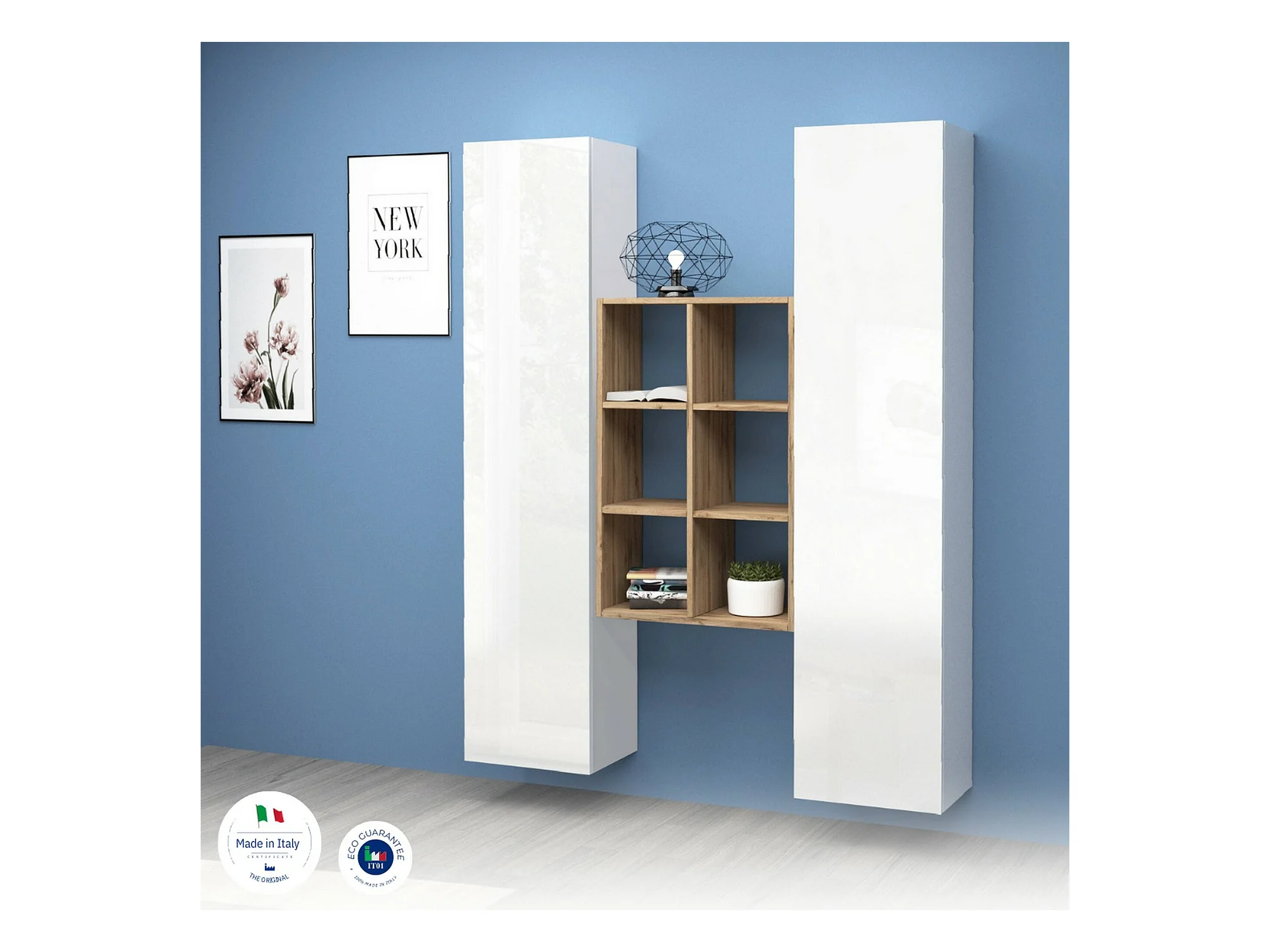 Buffet Ddeluc, Ensemble de salon avec 2 portes et étagères, Buffet de salon, Buffet de cuisine, 100% Made in Italy, 140x30h180 cm, Blanc brillant et Érable