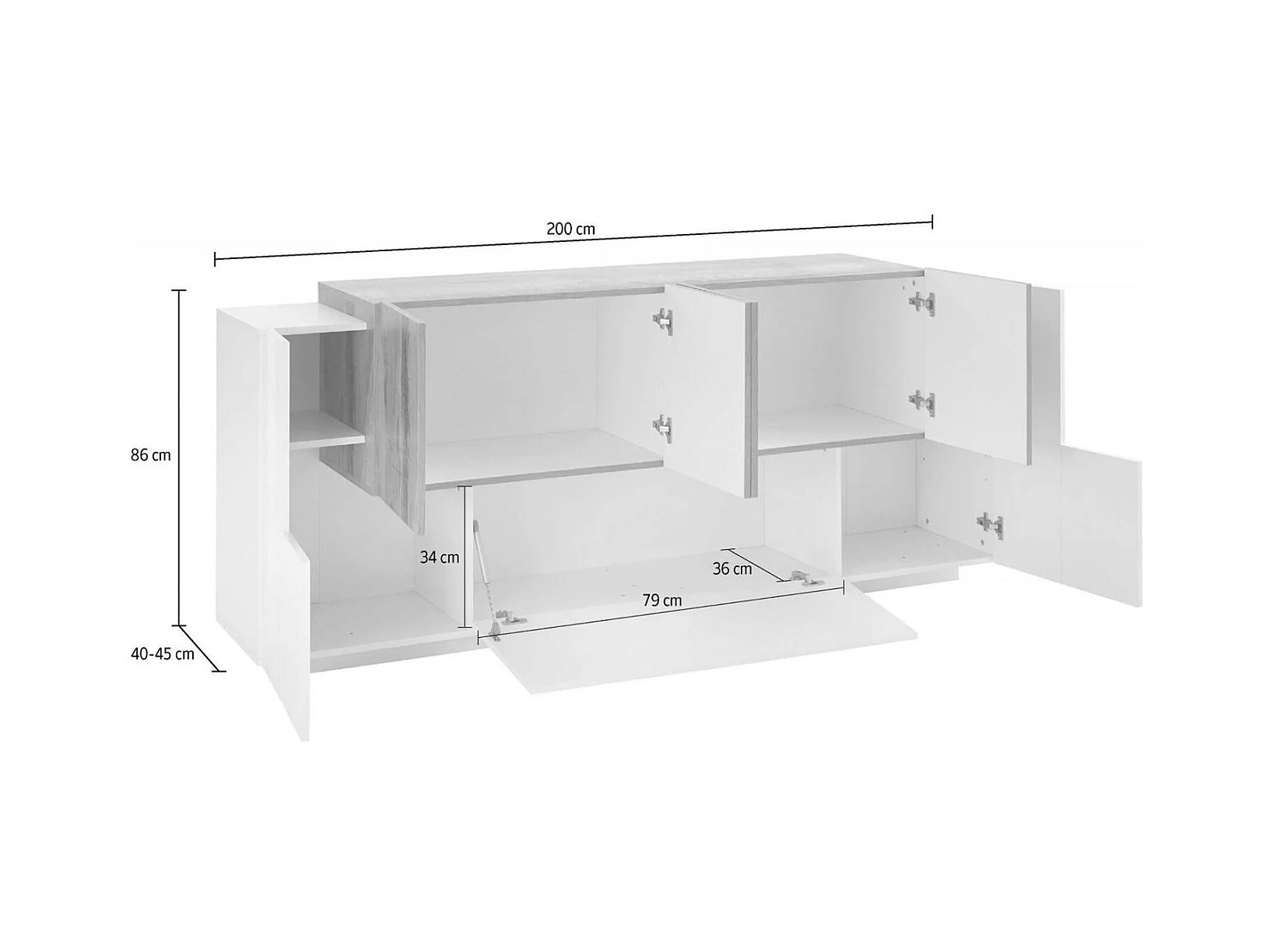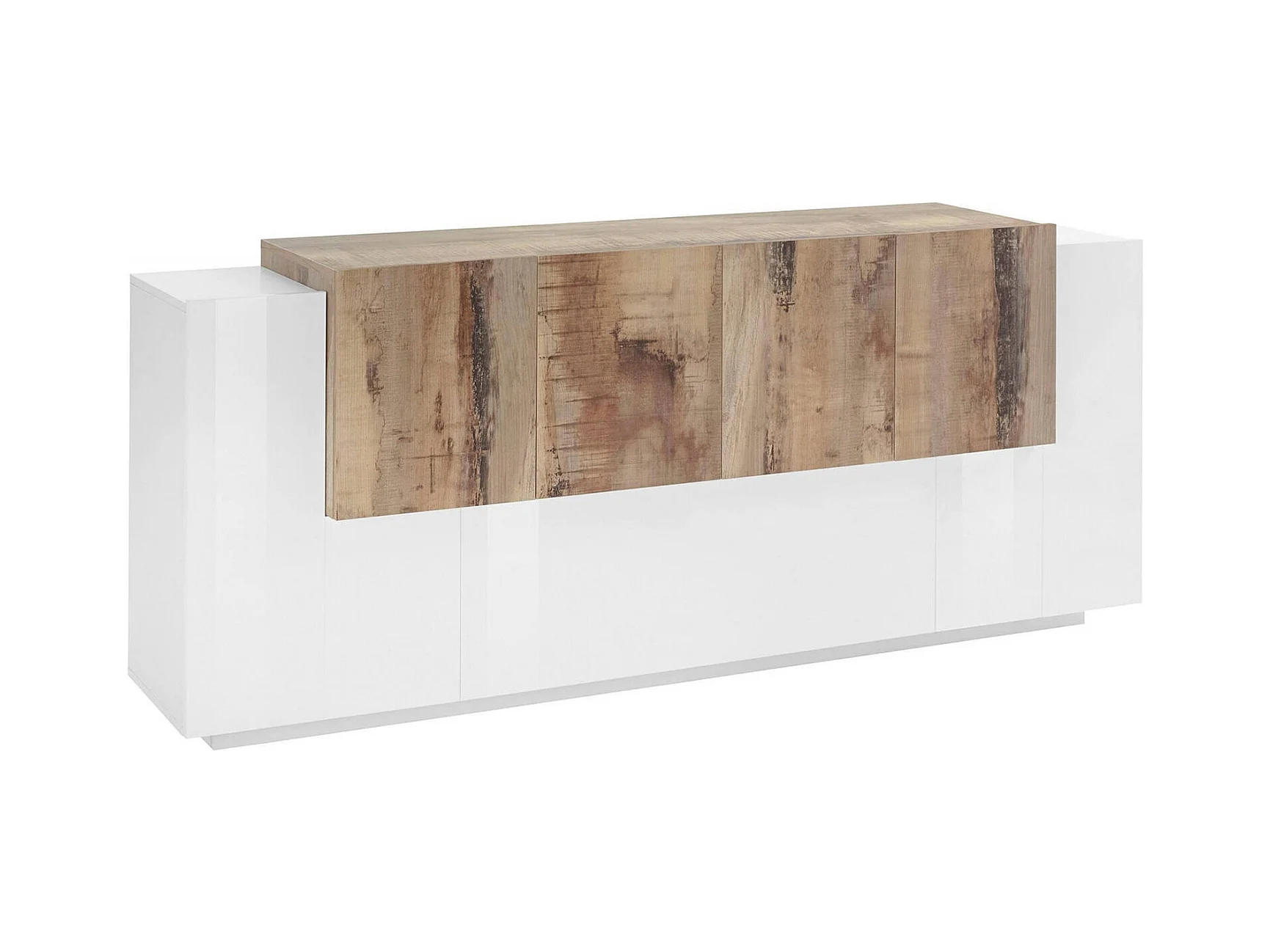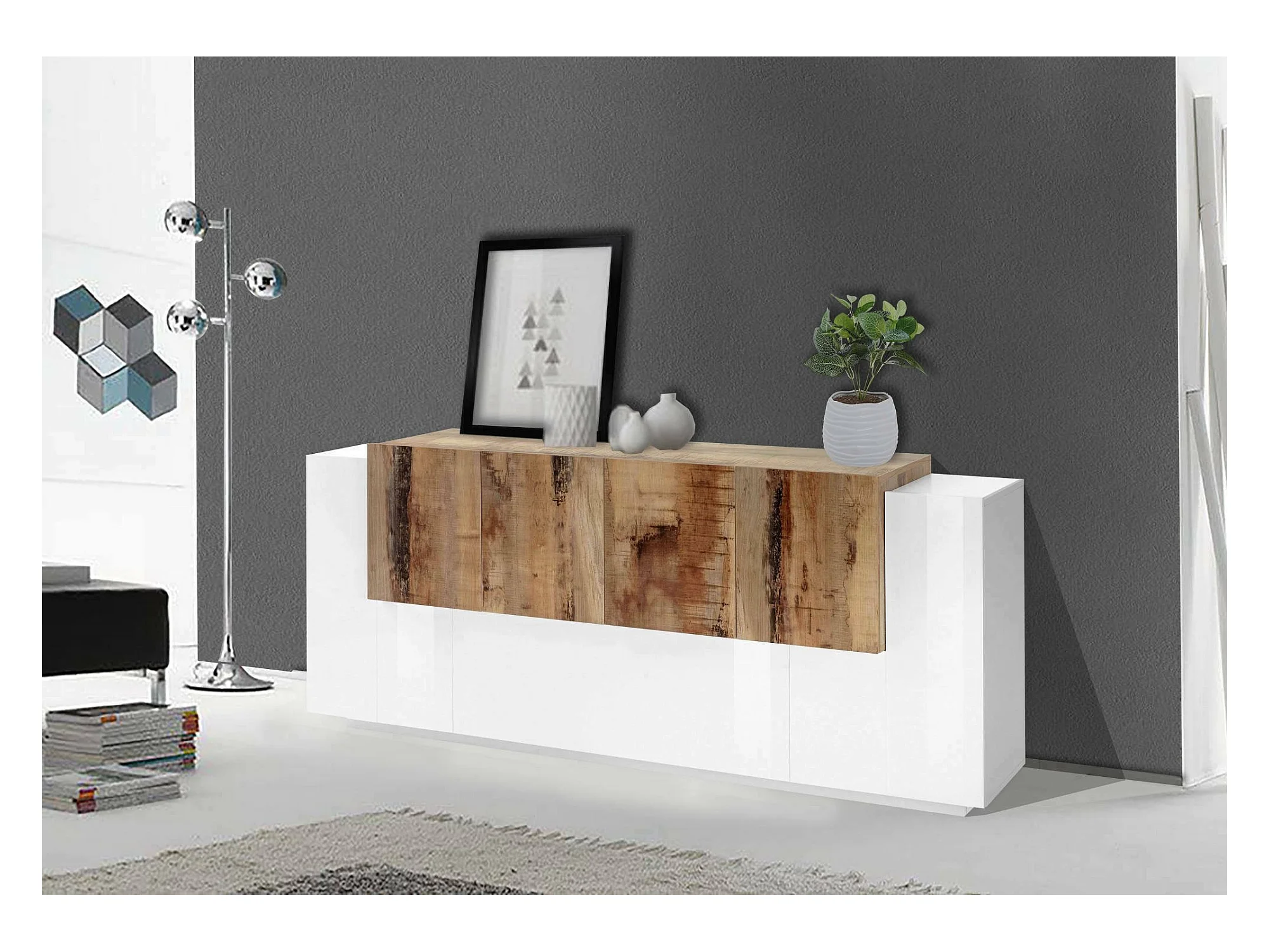 Buffet Dgerl, Buffet de cuisine avec 4 portes, Buffet de salon, 100% Made in Italy, 200x45h86 cm, Blanc brillant et érable