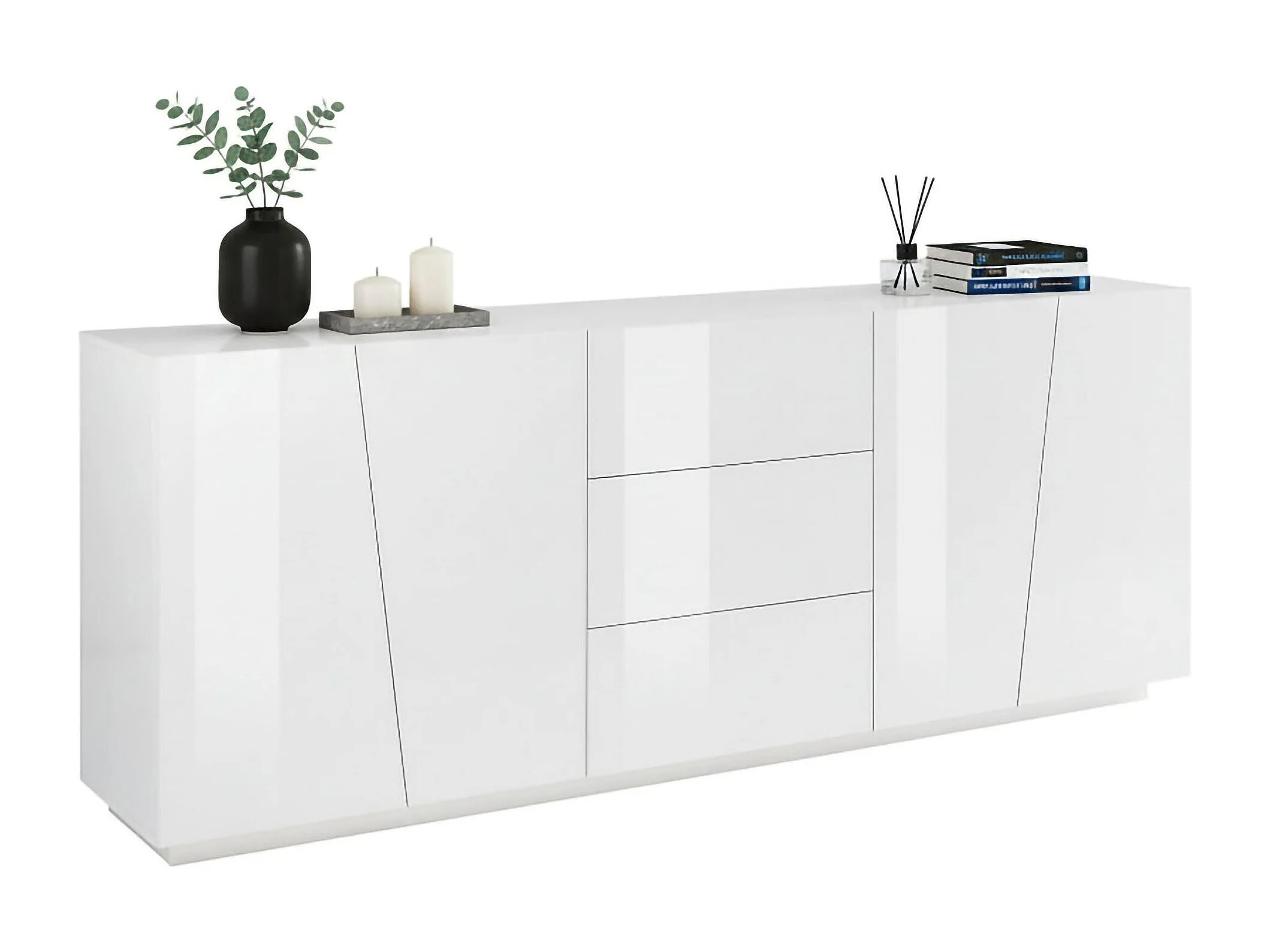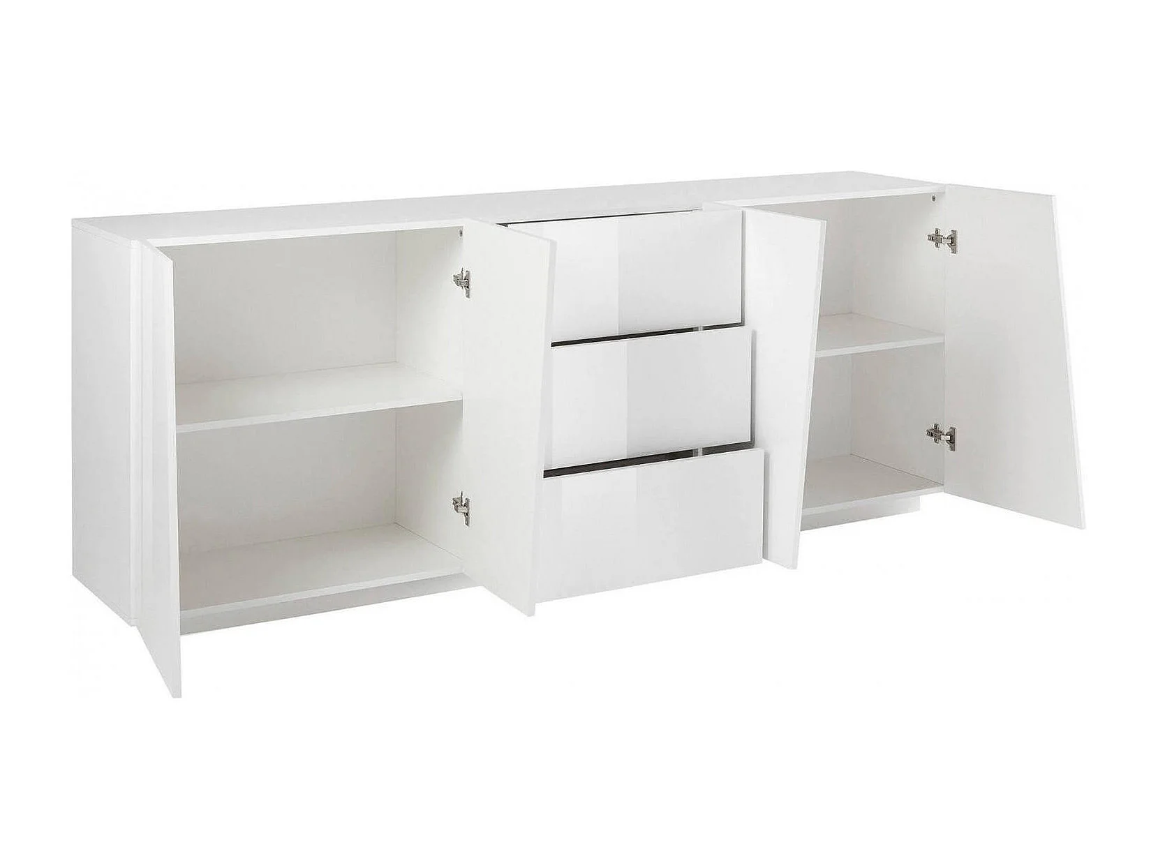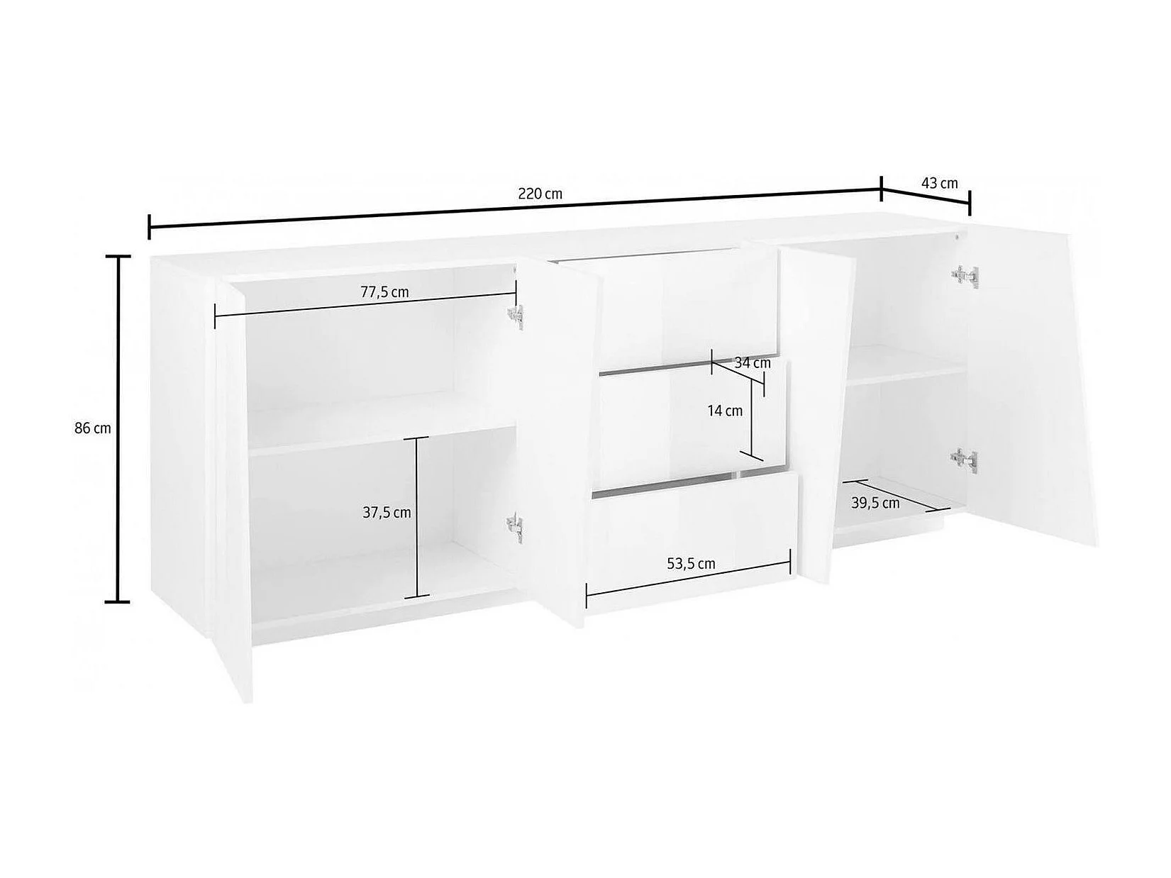 Buffet Dmicill, Buffet de cuisine avec 4 portes et 3 tiroirs, Buffet de salon, 100% Made in Italy, 220x43h86 cm, Blanc brillant