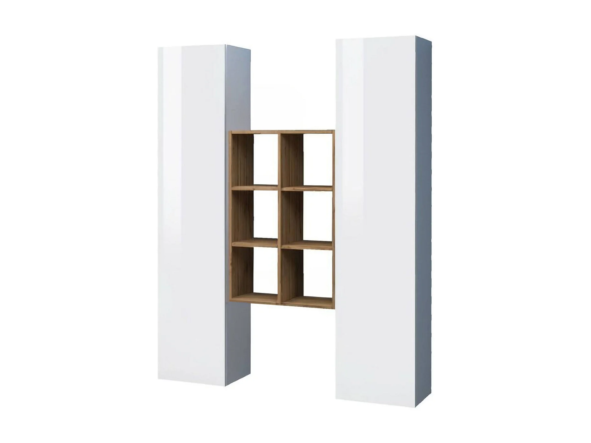 Buffet Franco, Ensemble de salon avec 2 portes et étagères, Buffet de salon, Buffet de cuisine, 100% Made in Italy, 140x30h180 cm, Blanc brillant et Érable