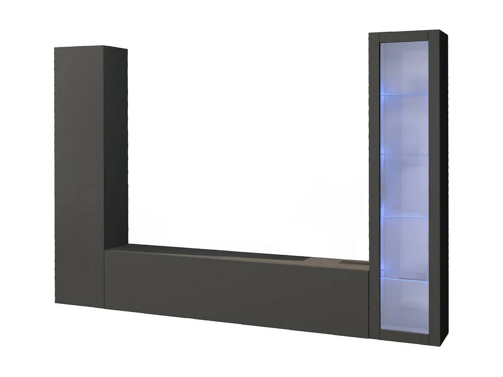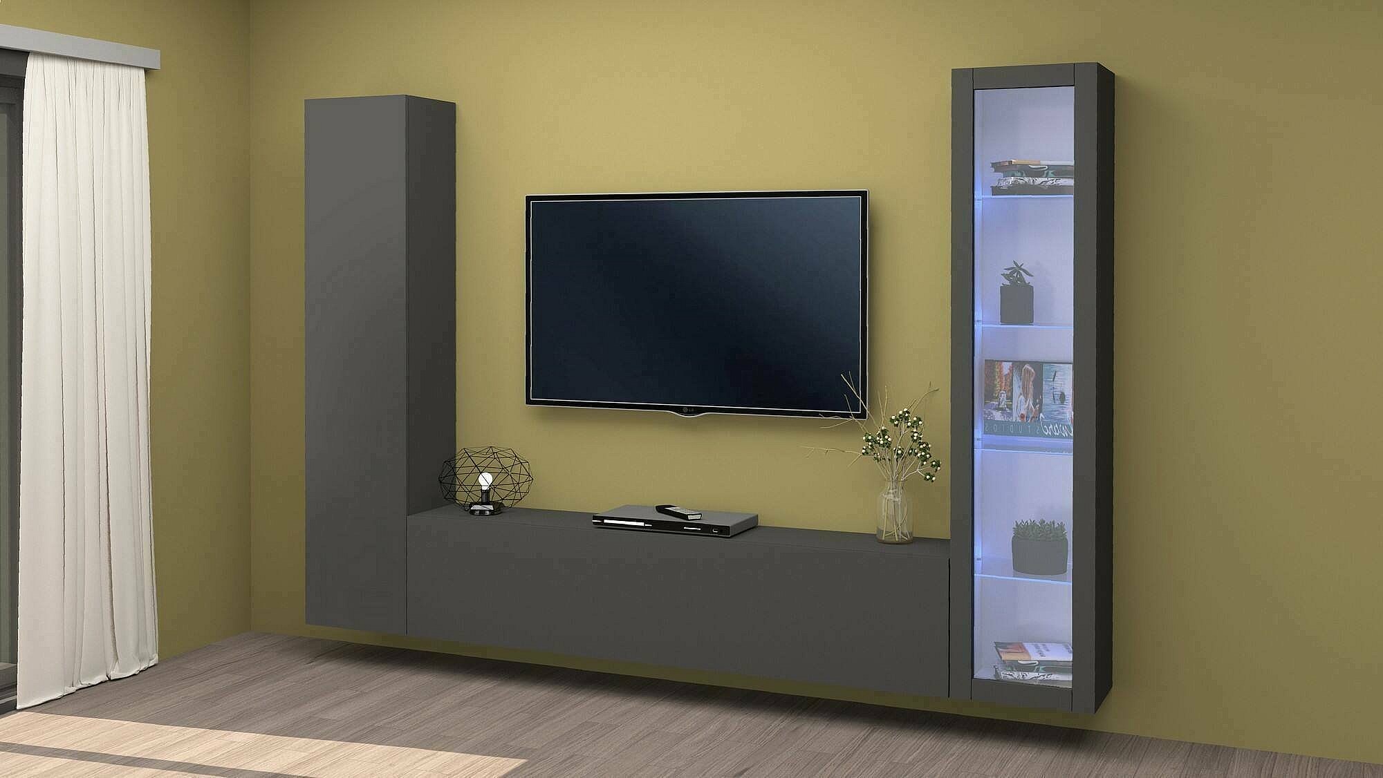 Système mural Girolamo, ensemble de salon meuble TV 3 portes, meuble de salon polyvalent avec vitrine et lumière LED, 100% Made in Italy, 260x30h180 cm, Anthracite