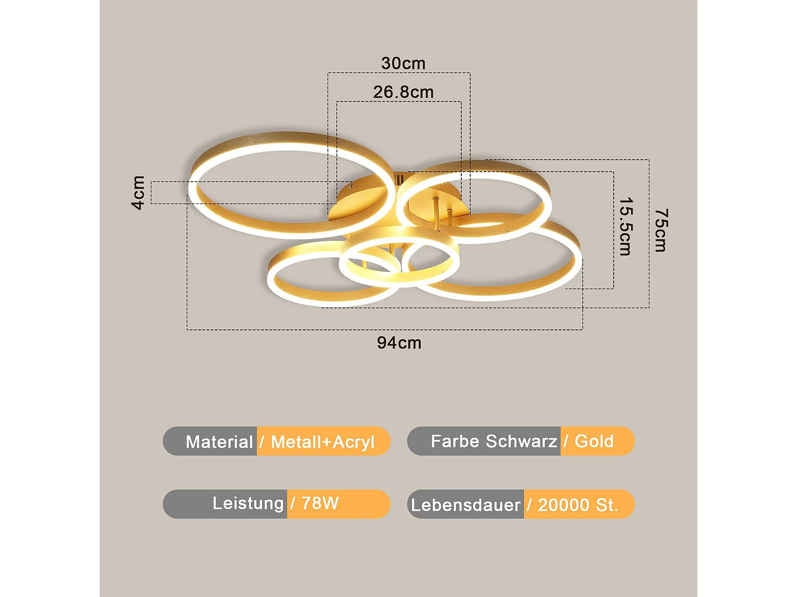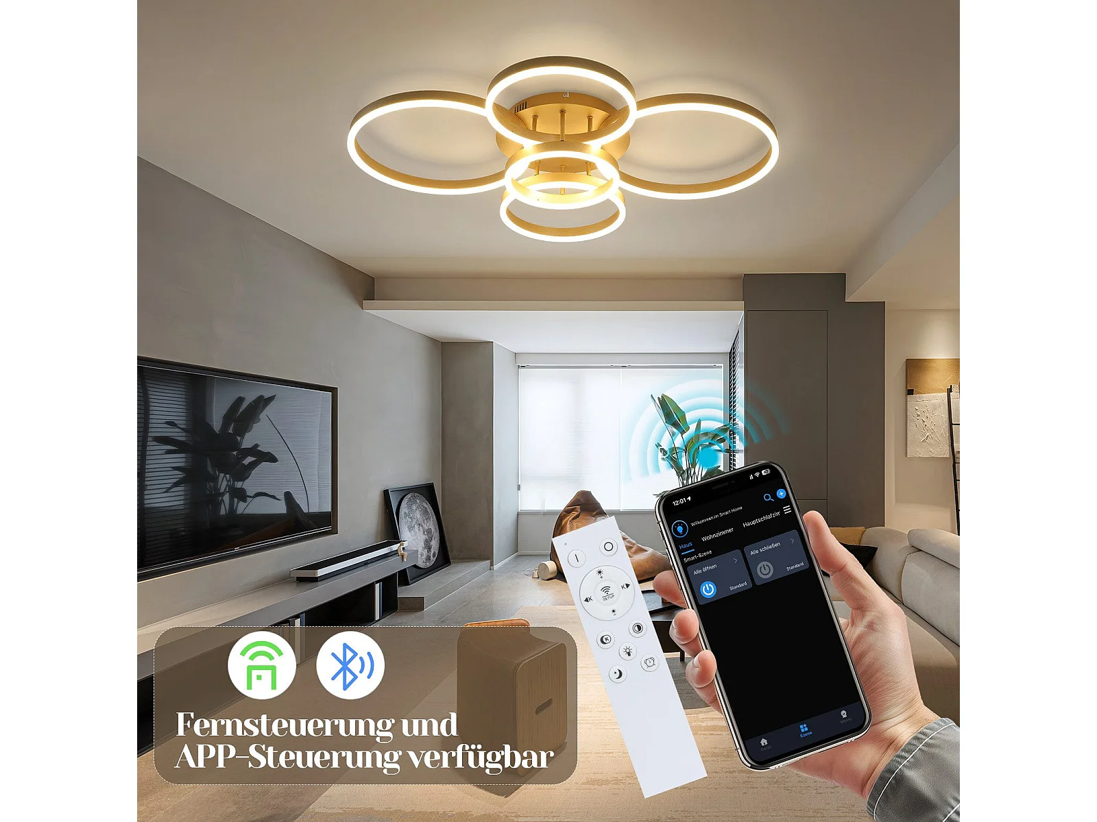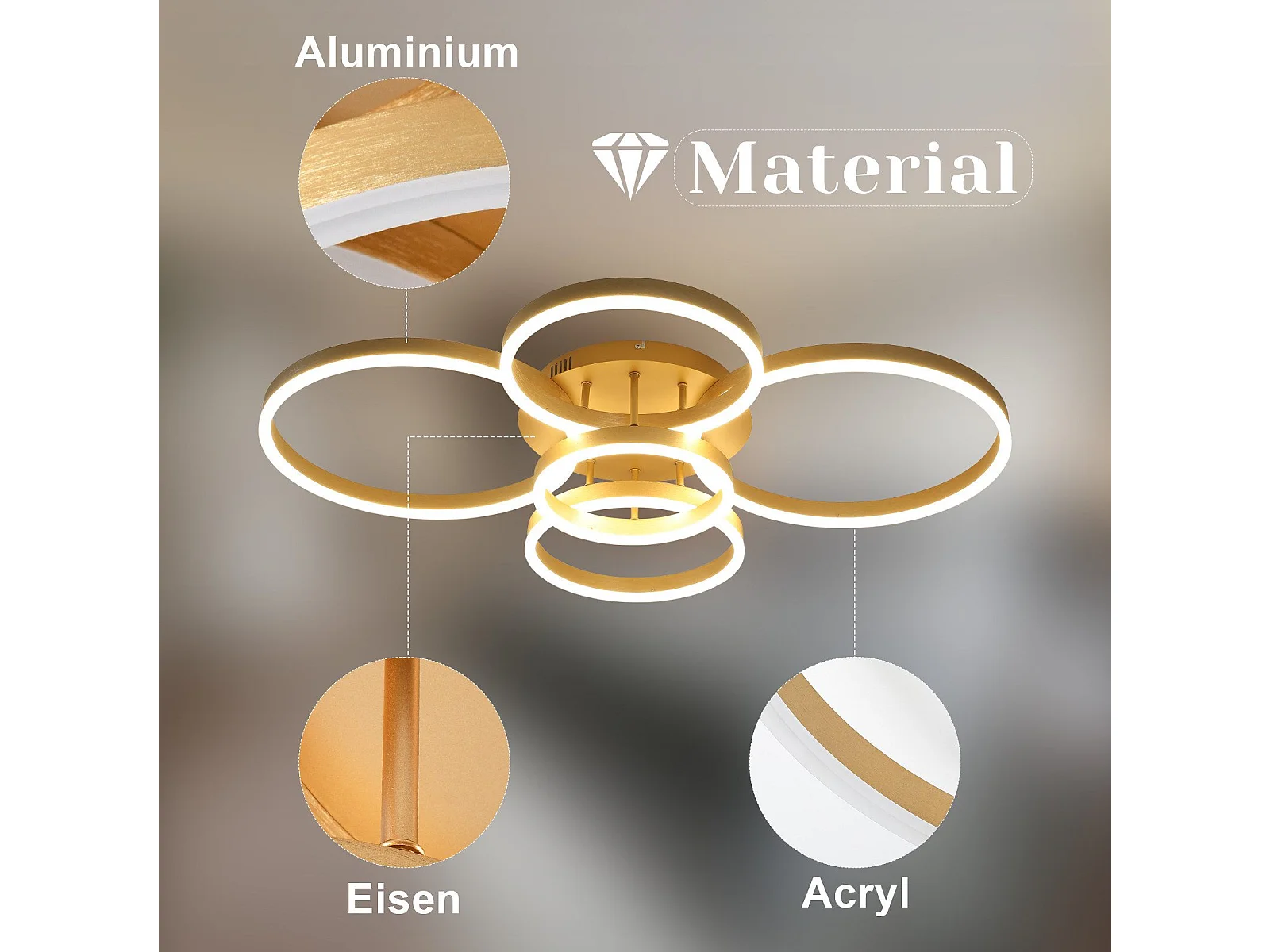 Plafonnier LED NETTLIFE doré à 2 anneaux en acrylique, 46 W, intensité variable, pour salon, moderne, 59 cm, avec télécommande