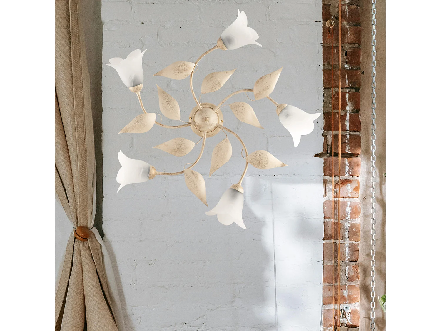 Plafonnier Olga fer ivoire, déco or antique, verre albâtre d.14, 5 lumières d.70 cm look classique raffiné