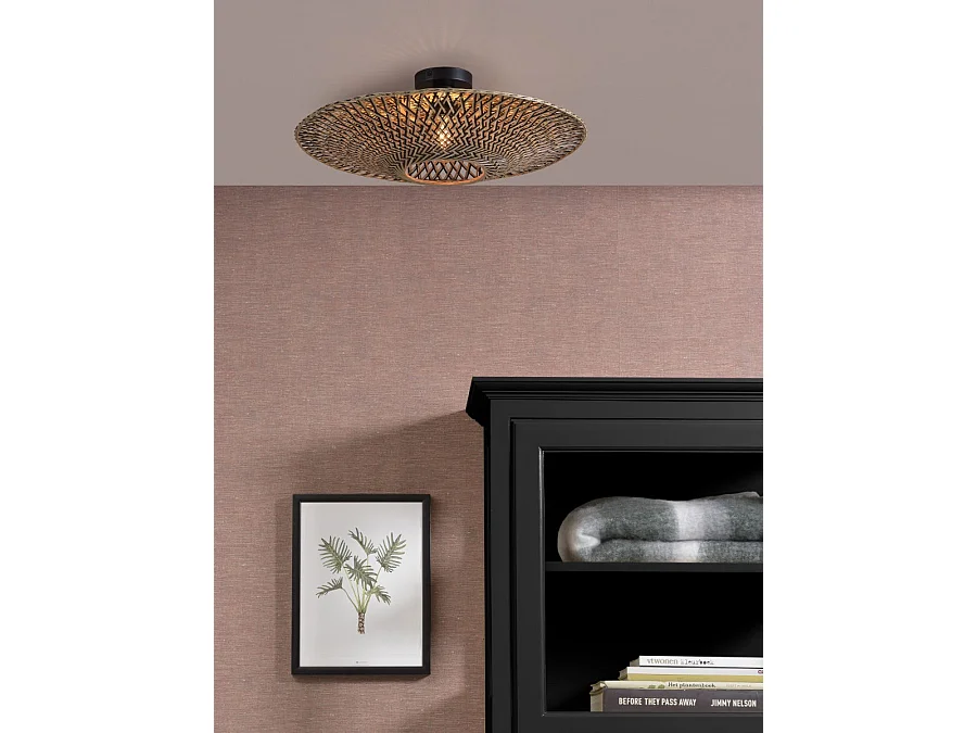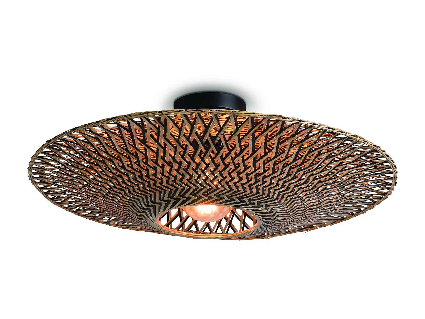 Plafonnier rond en bambou tressé marron avec pied en métal noir