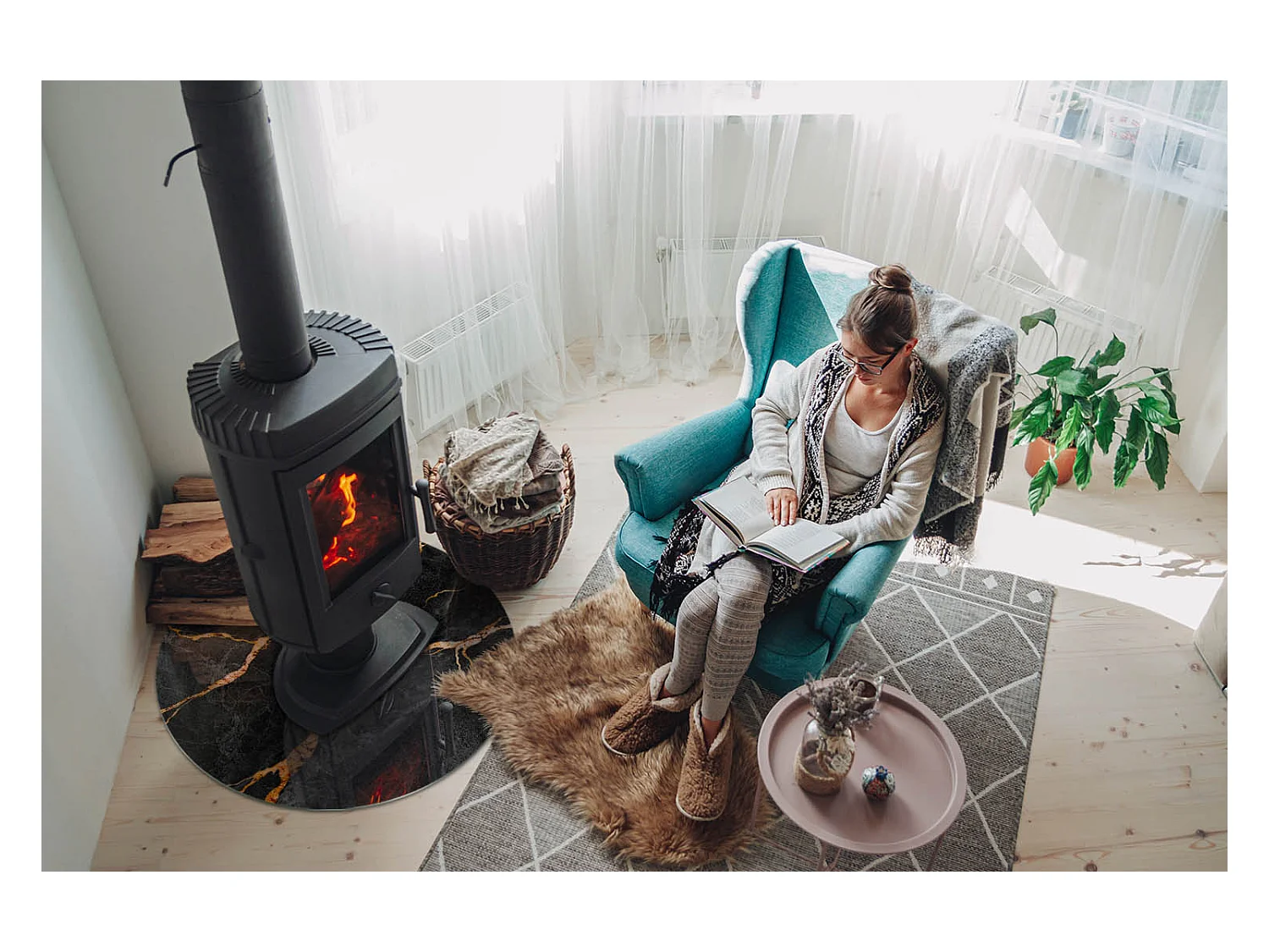 Plaque de sol en verre pour poêle - semi-circulaire - 100x100 - Géométrie avec le bois