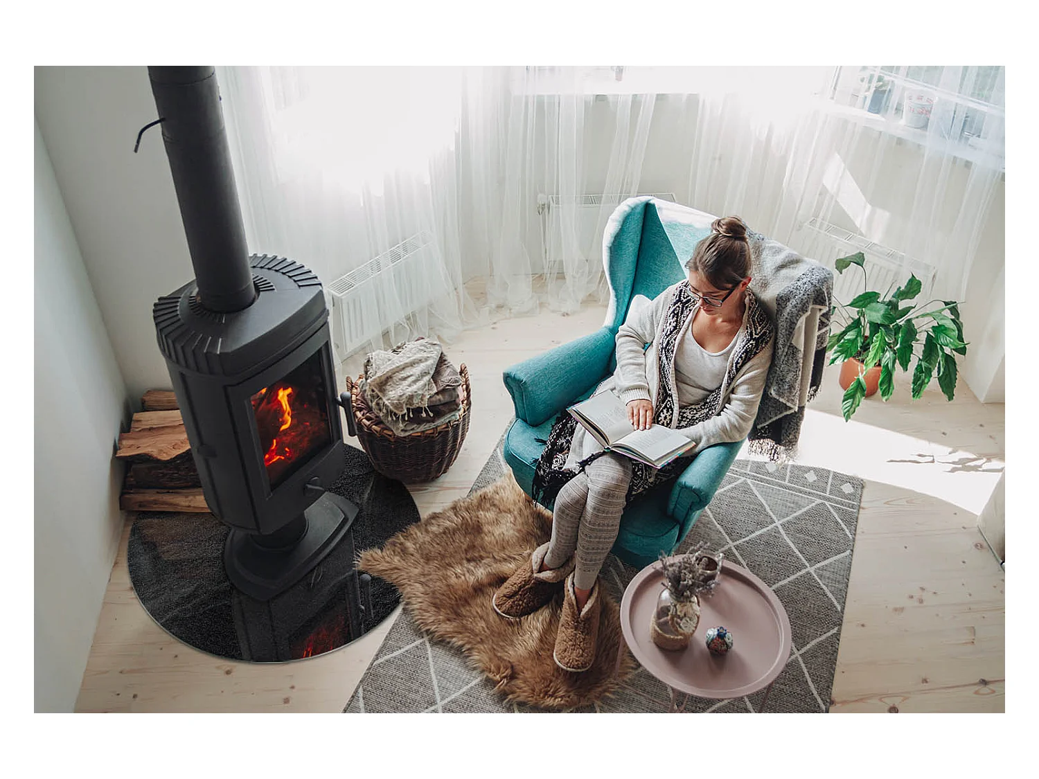Plaque de sol en verre pour poêle - semi-circulaire - 100x100 - Géométrie avec le bois