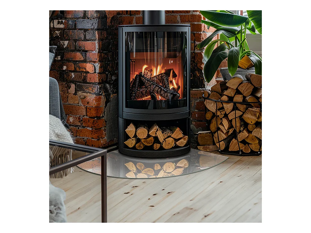 Plaque de sol en verre pour poêle - semi-circulaire - 100x100 - Une boîte avec du bois coupé