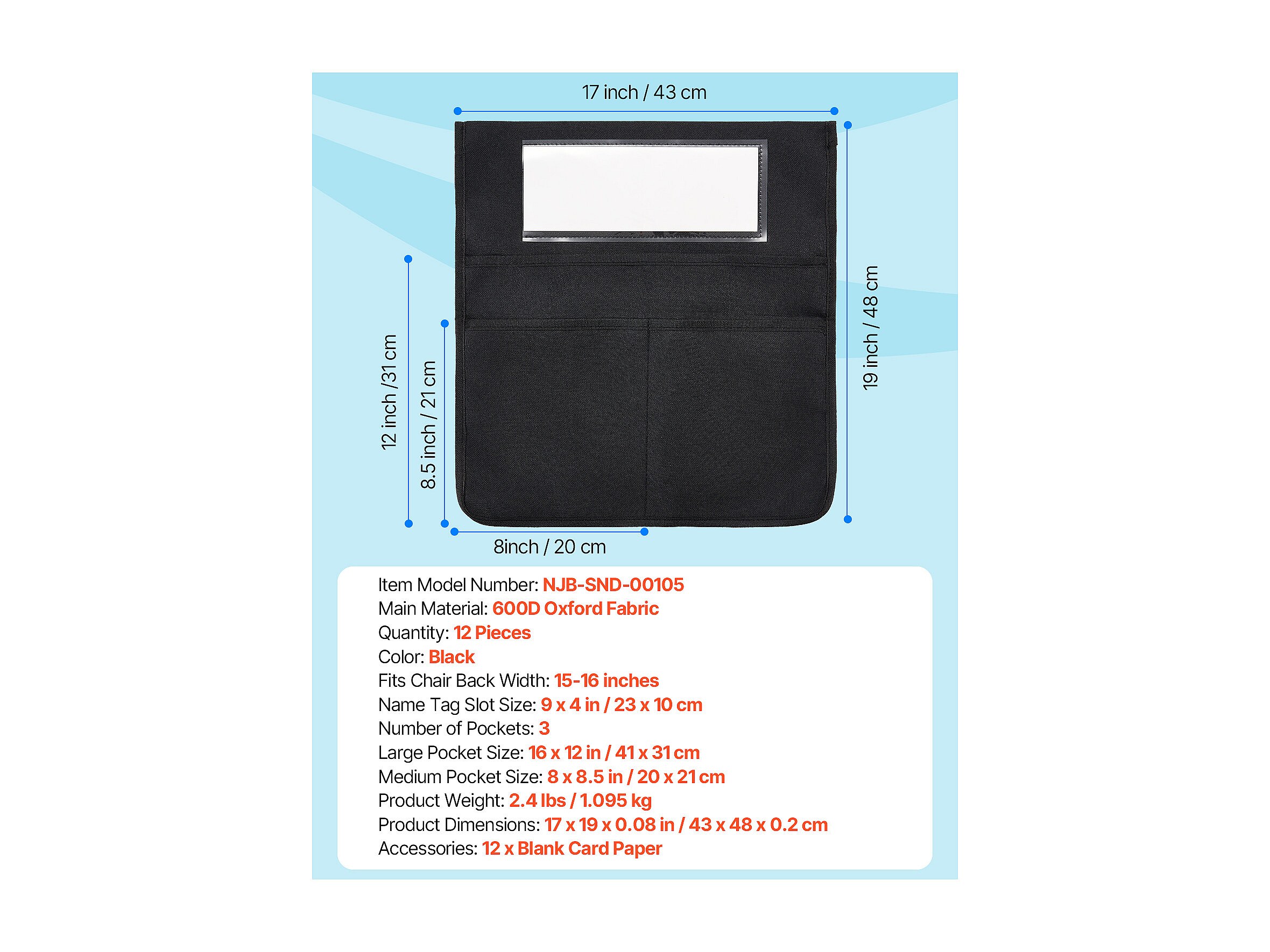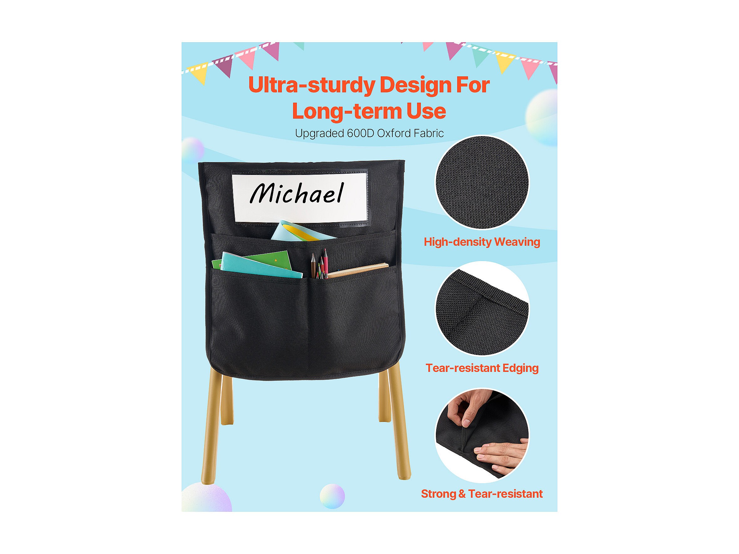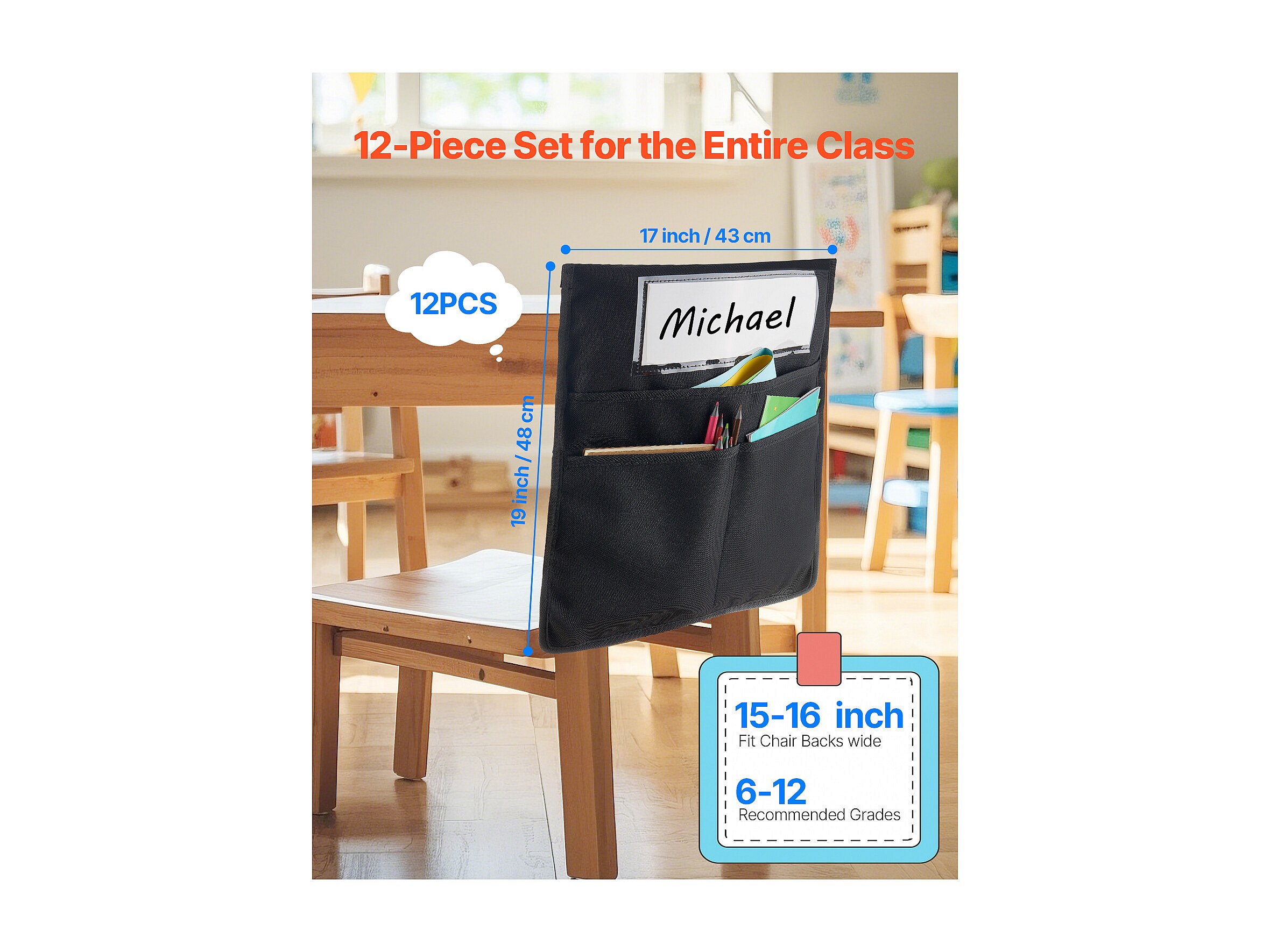 Pochette de Chaise SucceBuy, Lot de 12, Poche Rangement Dossier Chaise, 43x48 cm, avec Étiquette Nominative, pour Salle de Classe, Maternelle, École, Maison, Noir