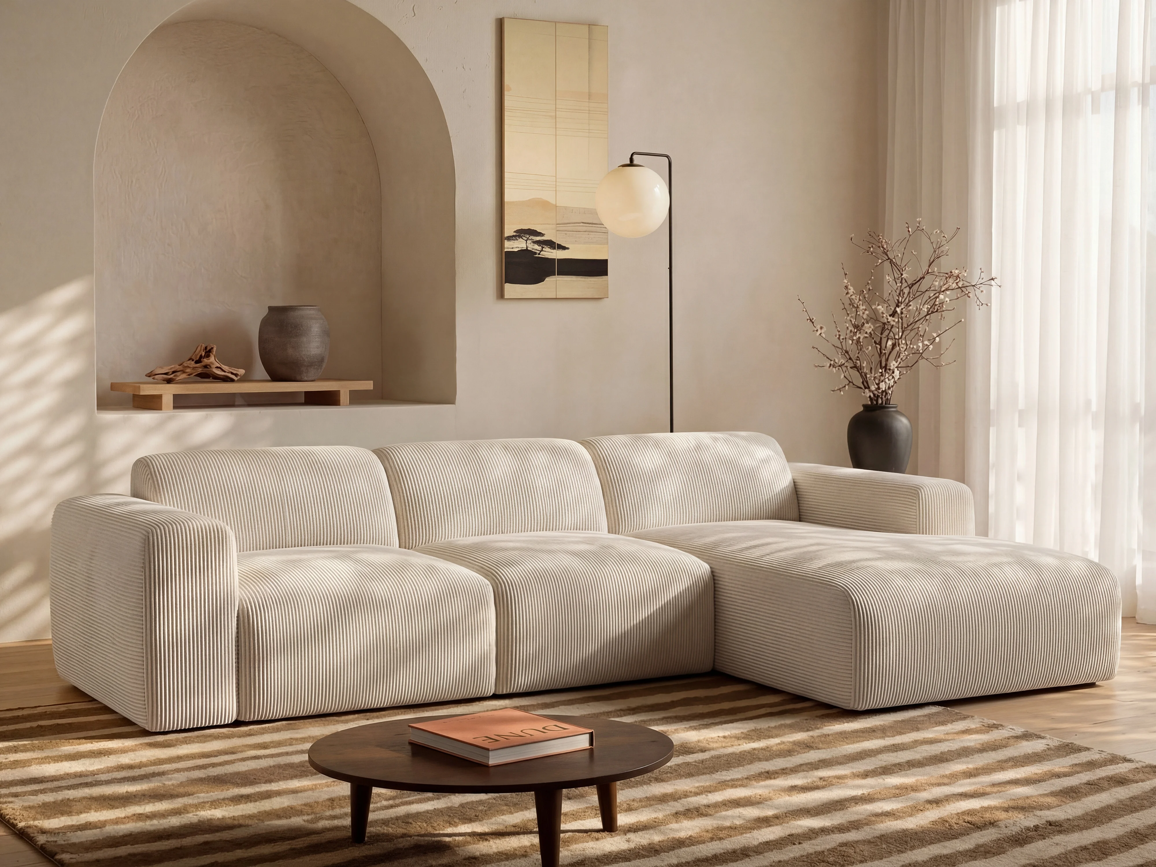Grand canapé d'angle droit avec assise coulissante électrique en velours côtelé fines côtes beige POGNI de Maison Céphy