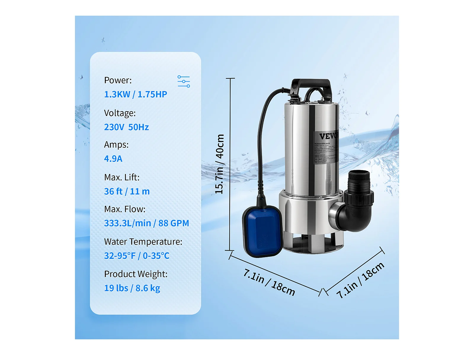 Pompe à Eau SucceBuy Submersible 1300W pour Eau Sale, Piscine, Étang de Jardin, Inondation