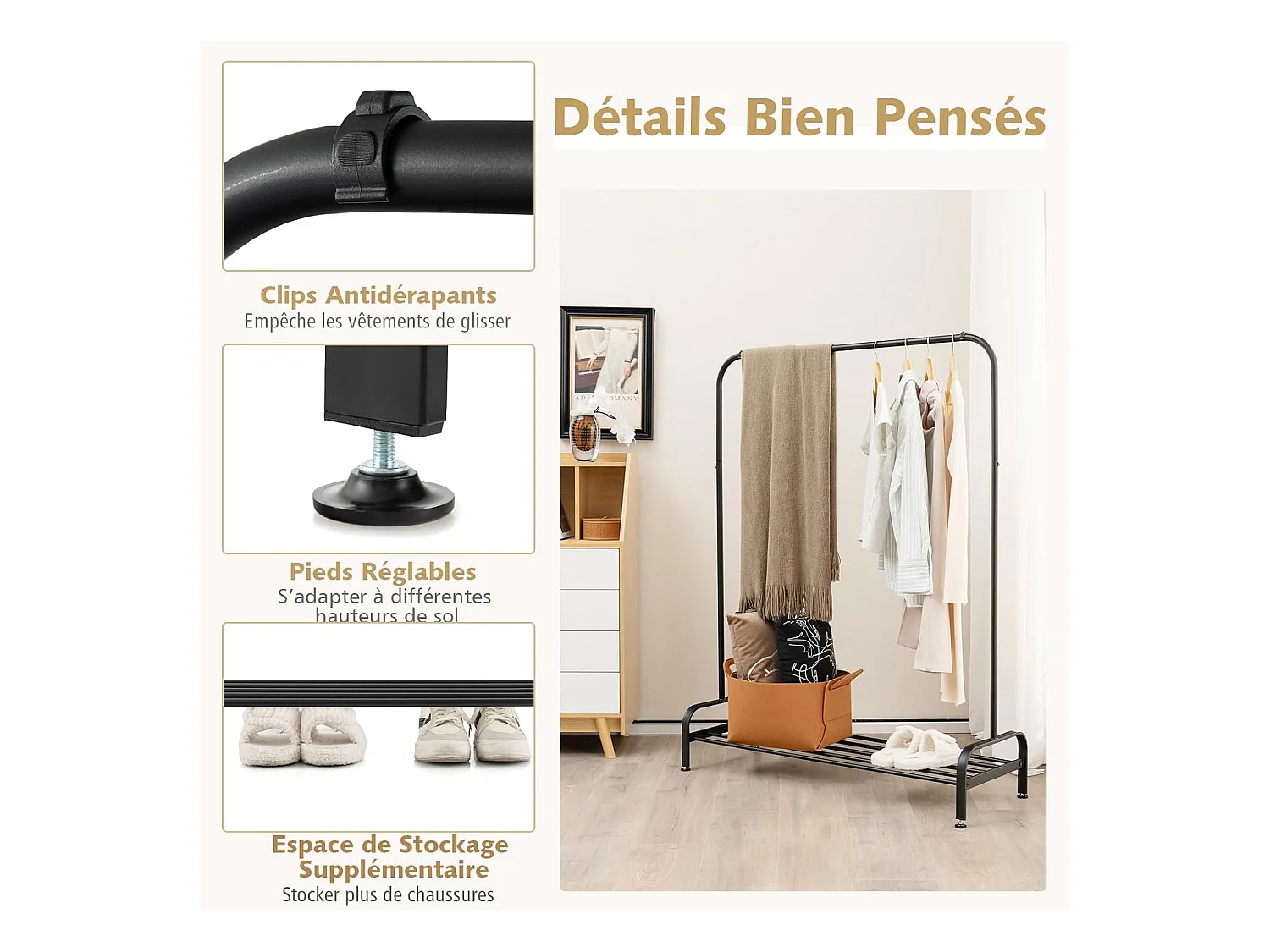 Porte-manteau sur roulettes,porte-manteau avec tringle,étagère à chaussures