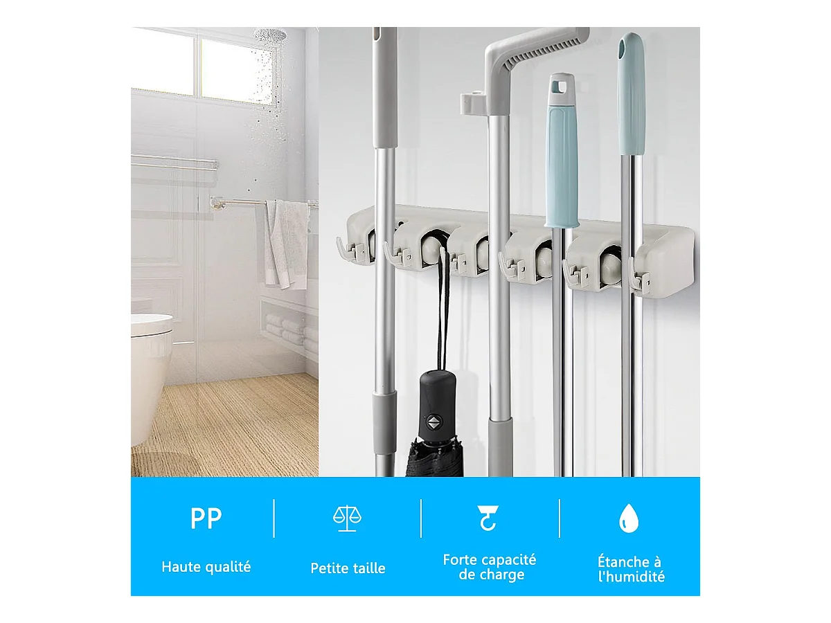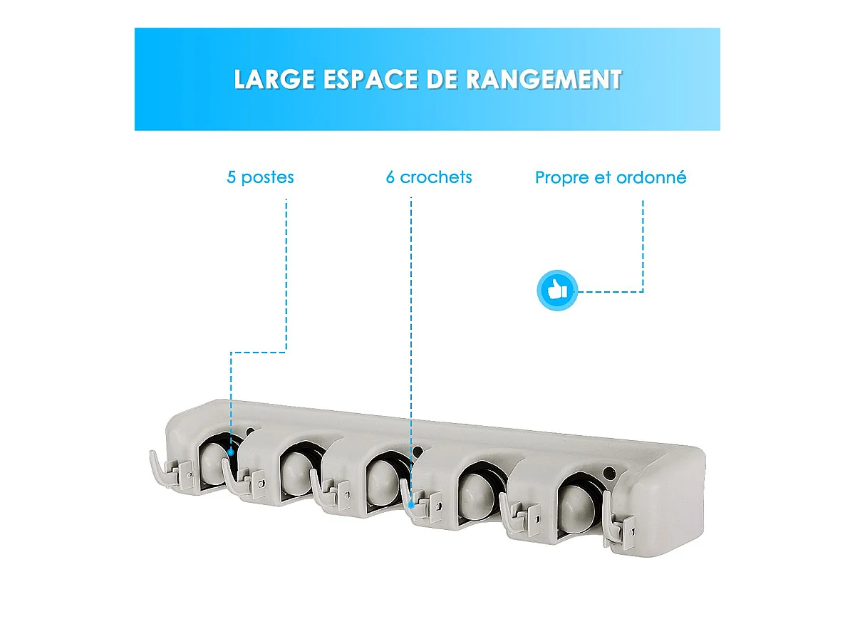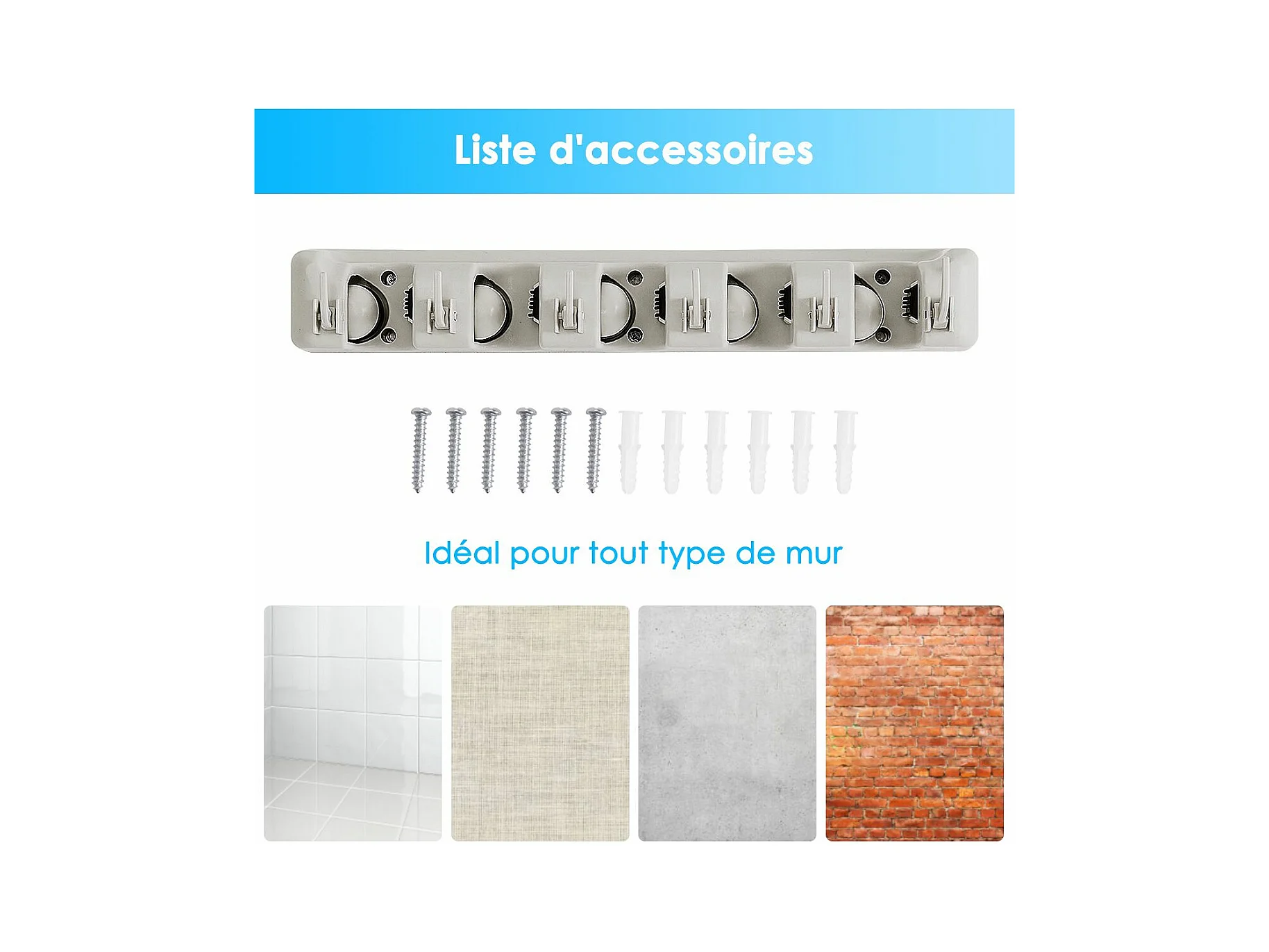 Porte Balais Mural avec 5 Emplacements et 6 Crochets/Support Balais Mural pour Salle de Bain, Cuisine ou Garage-Blanc