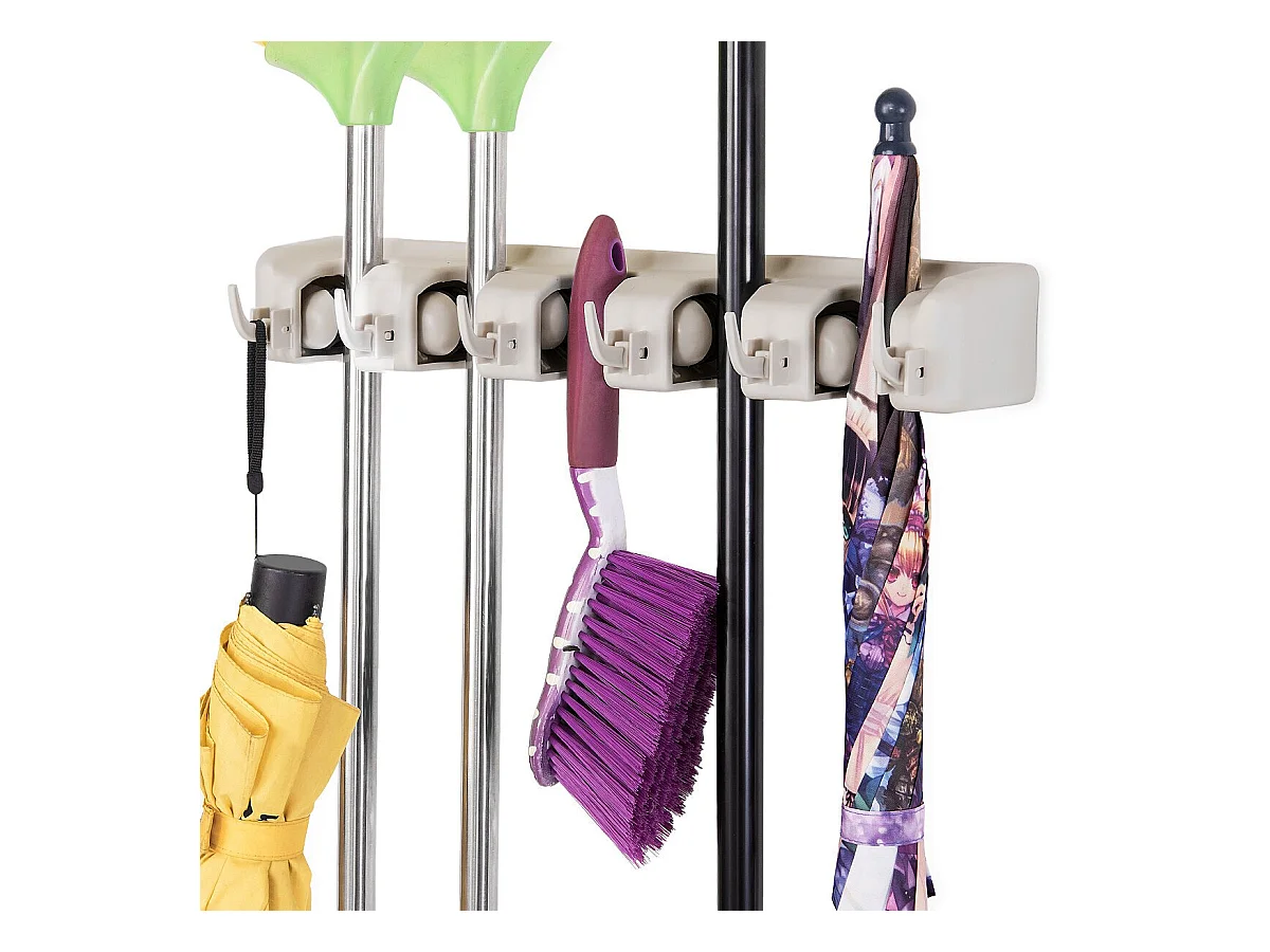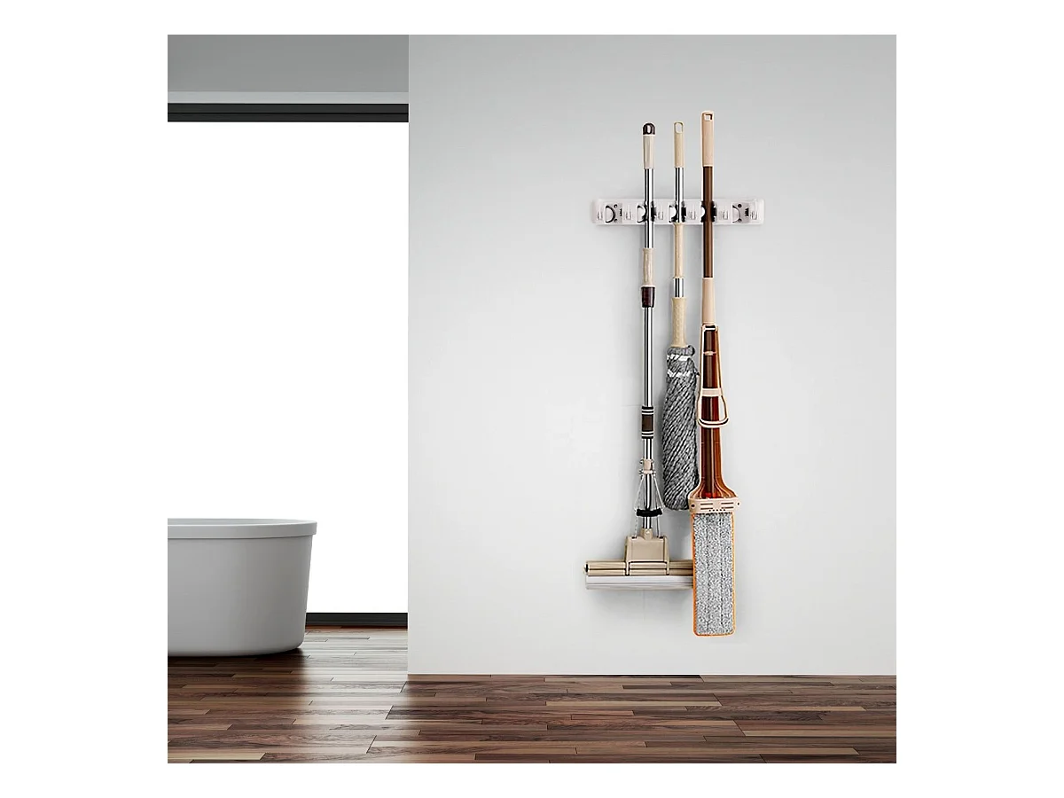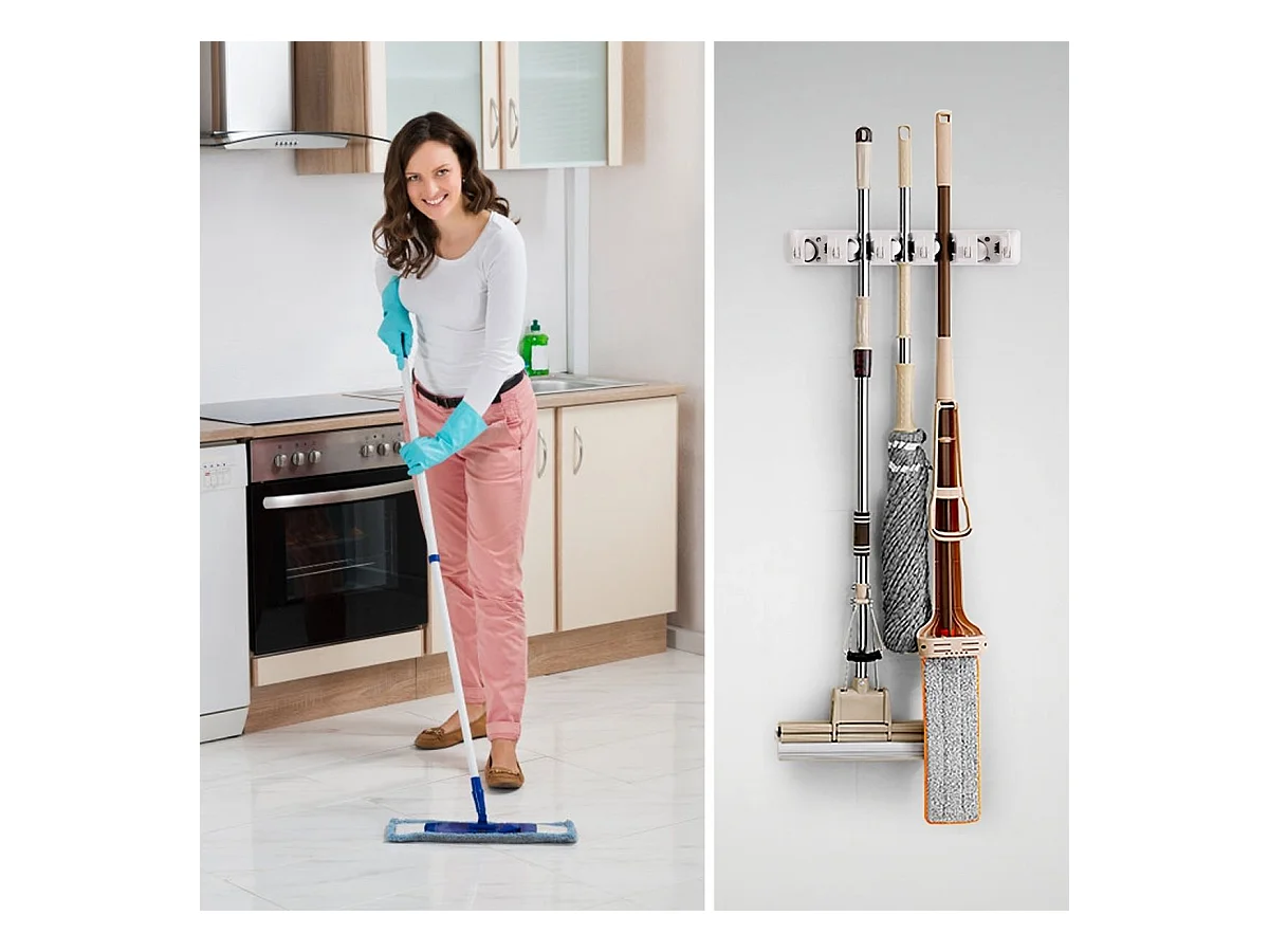 Porte Balais Mural avec 5 Emplacements et 6 Crochets/Support Balais Mural pour Salle de Bain, Cuisine ou Garage-Blanc