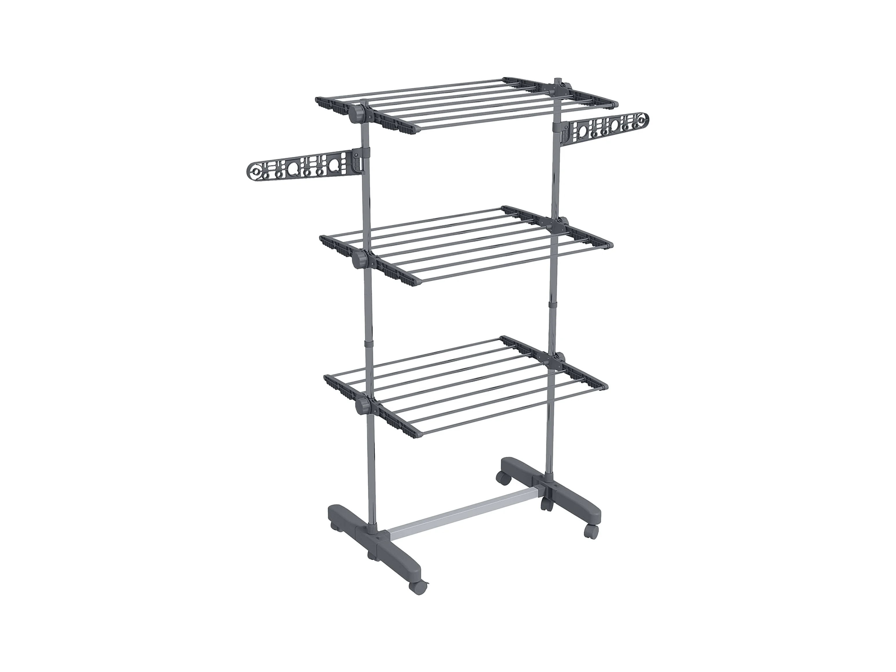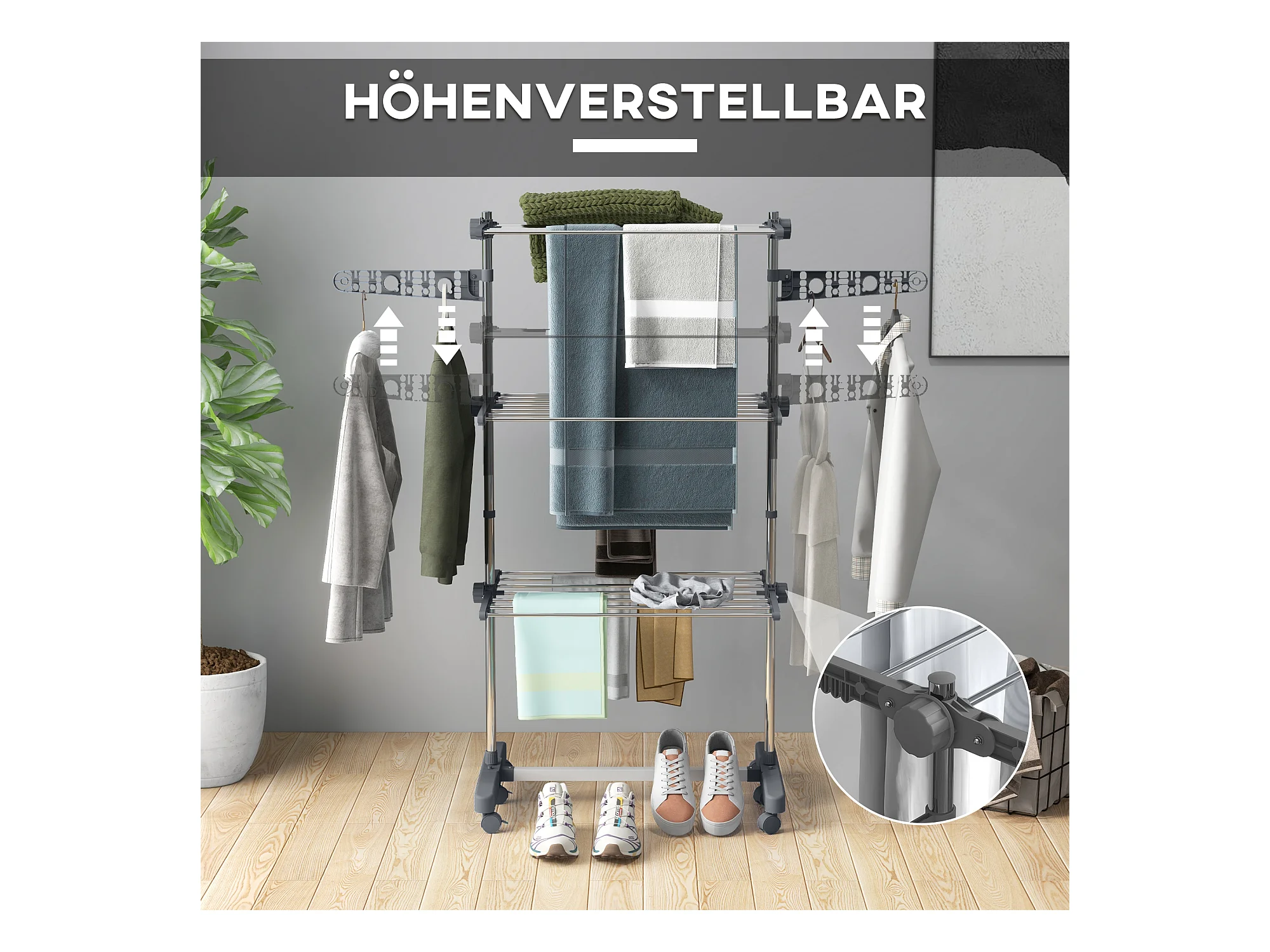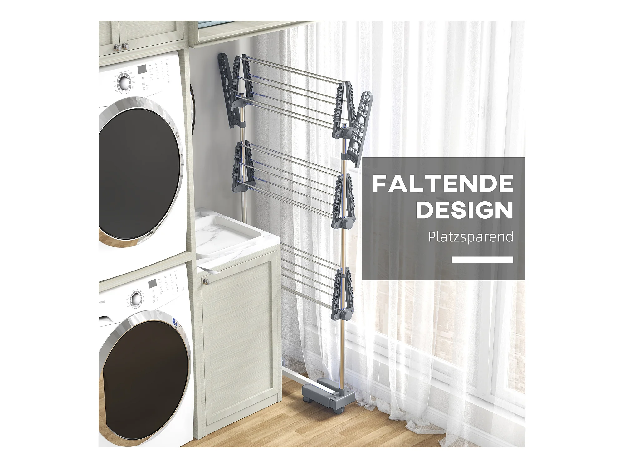 Séchoir à linge pliable à 3 niveaux, roulettes freinables, acier inoxydable, gris (138.5x63x208cm)