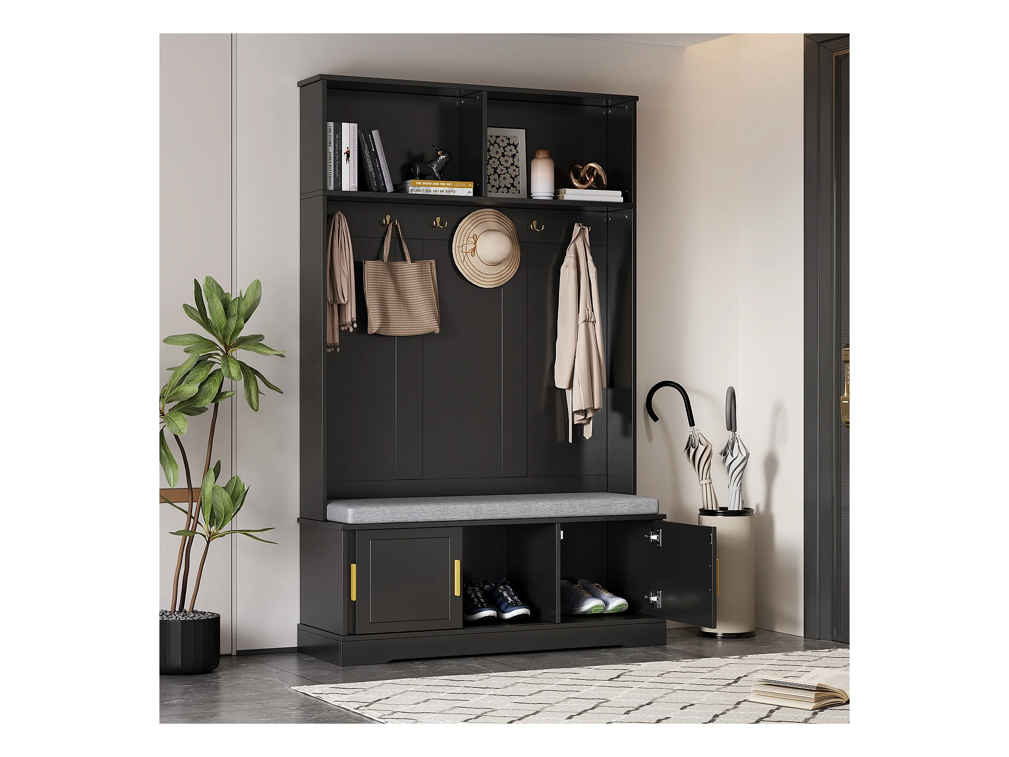 Ensemble de garde-robe avec banc, espace de rangement multifonctionnel, 6 crochets dorés et pieds métalliques, noir, (Dimensions : 120 x 40 x 191.5 cm)