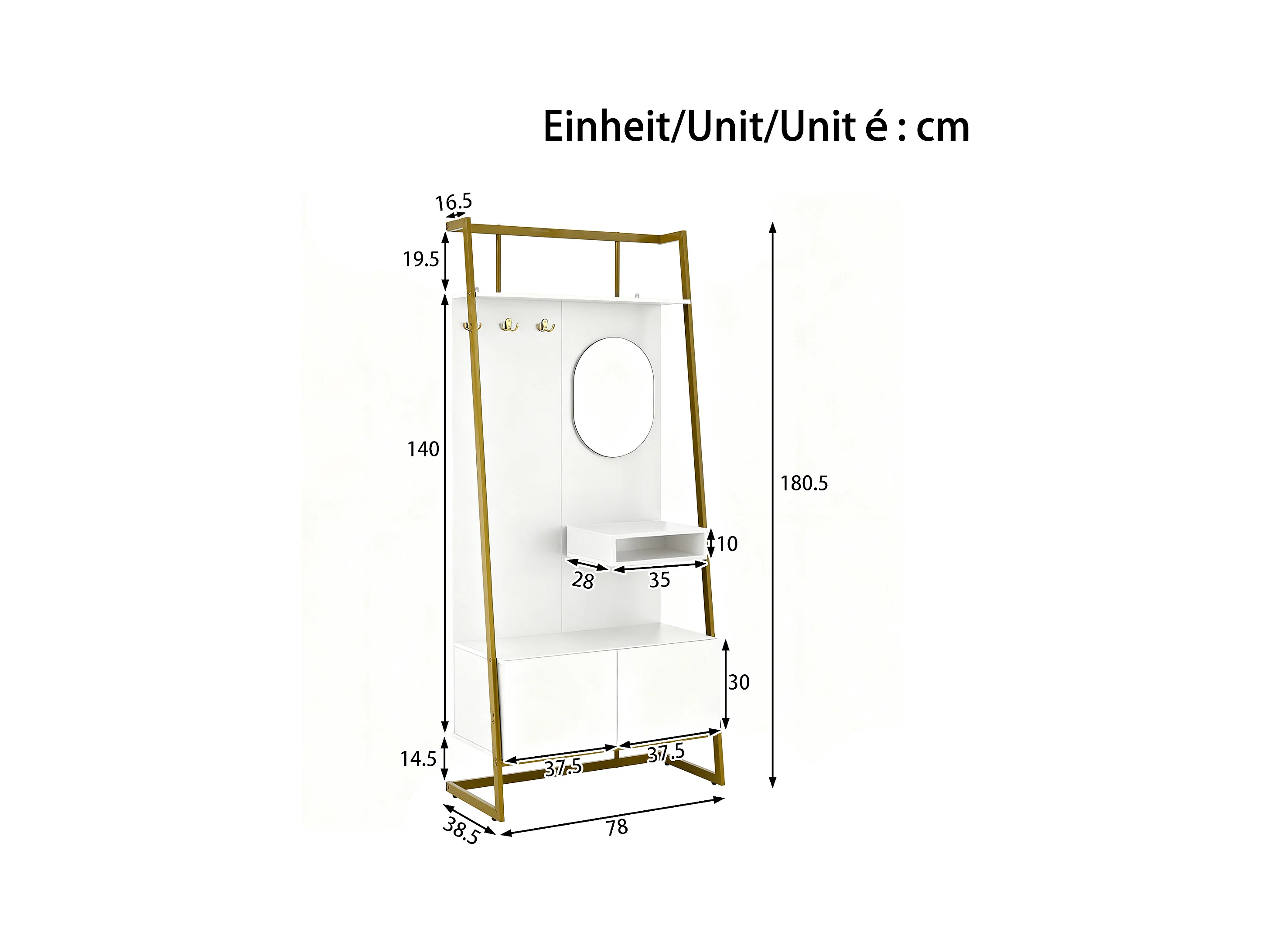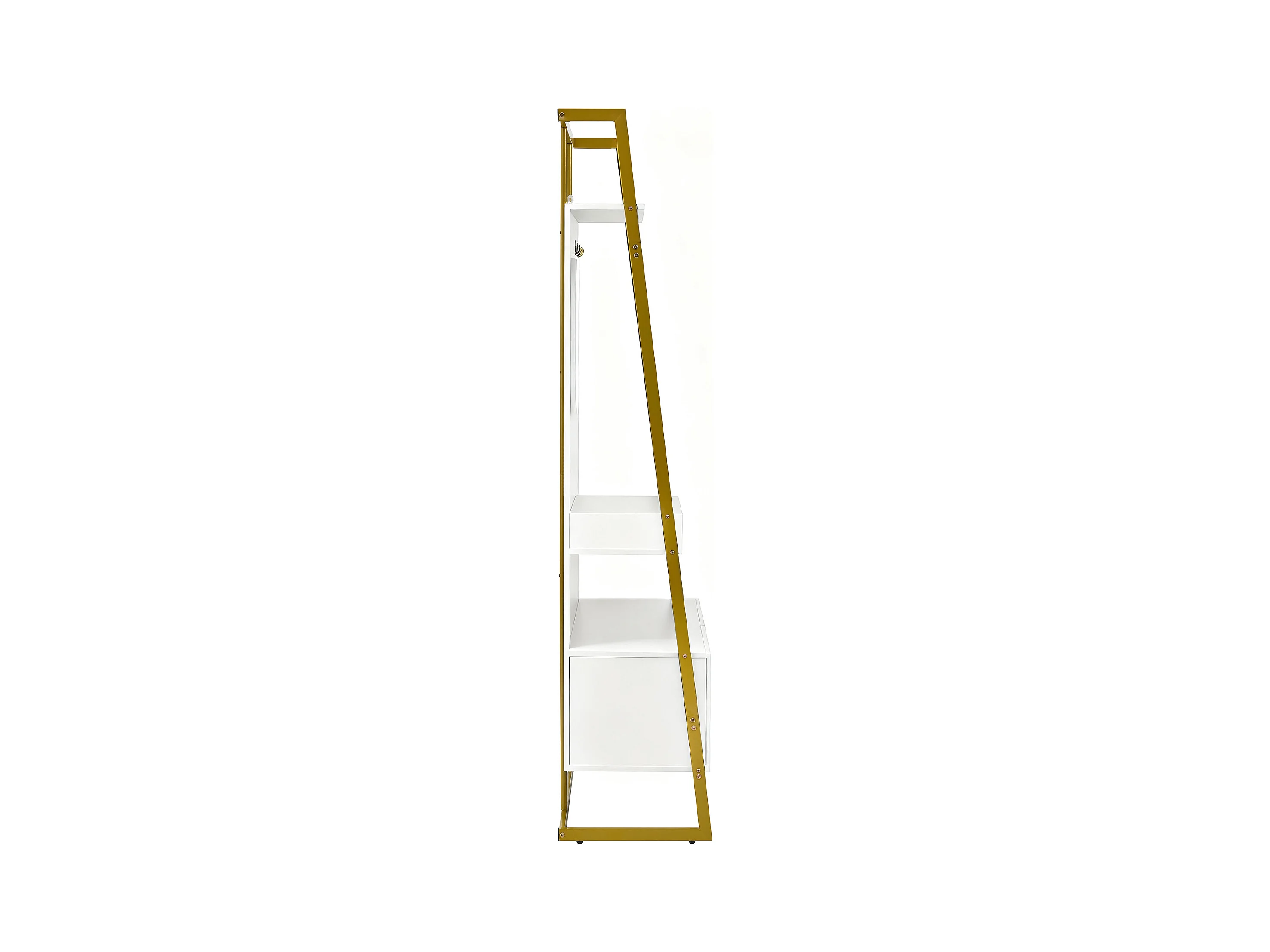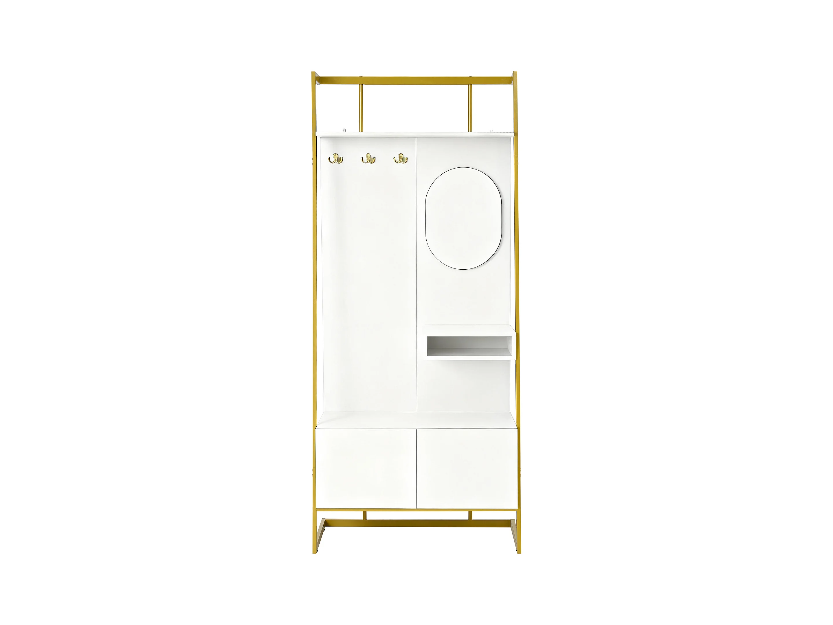 Porte-manteau blanc avec 2 portes et 1 tiroir de rangement, poignées et pieds dorés