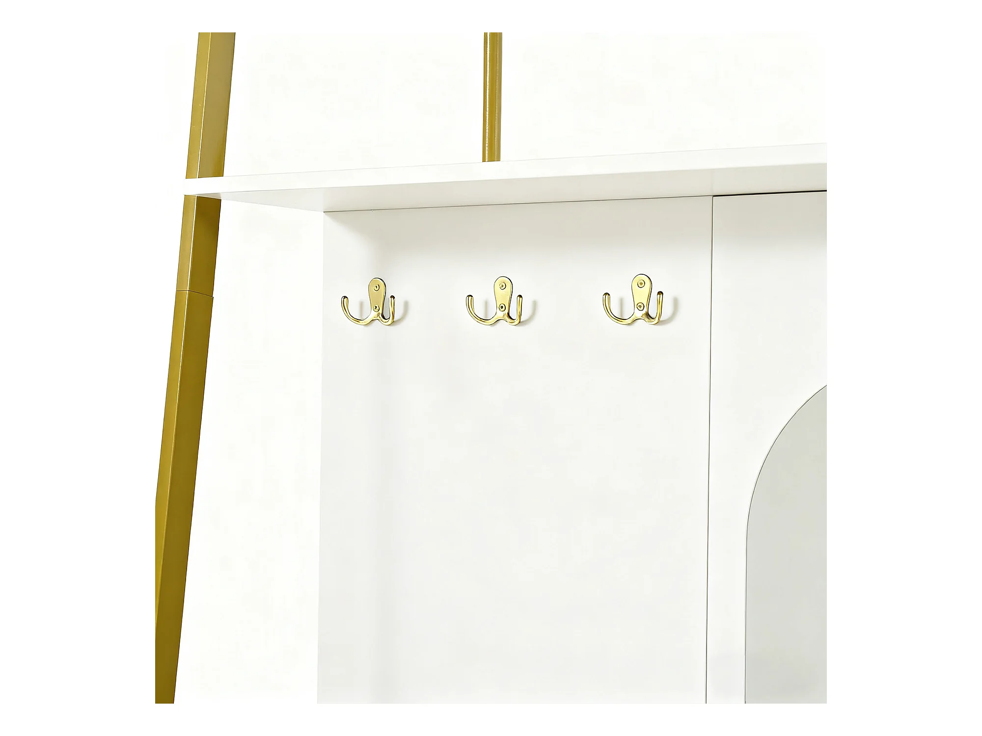 Porte-manteau avec meuble à chaussures 2 portes, patères métalliques et miroir - blanc et doré