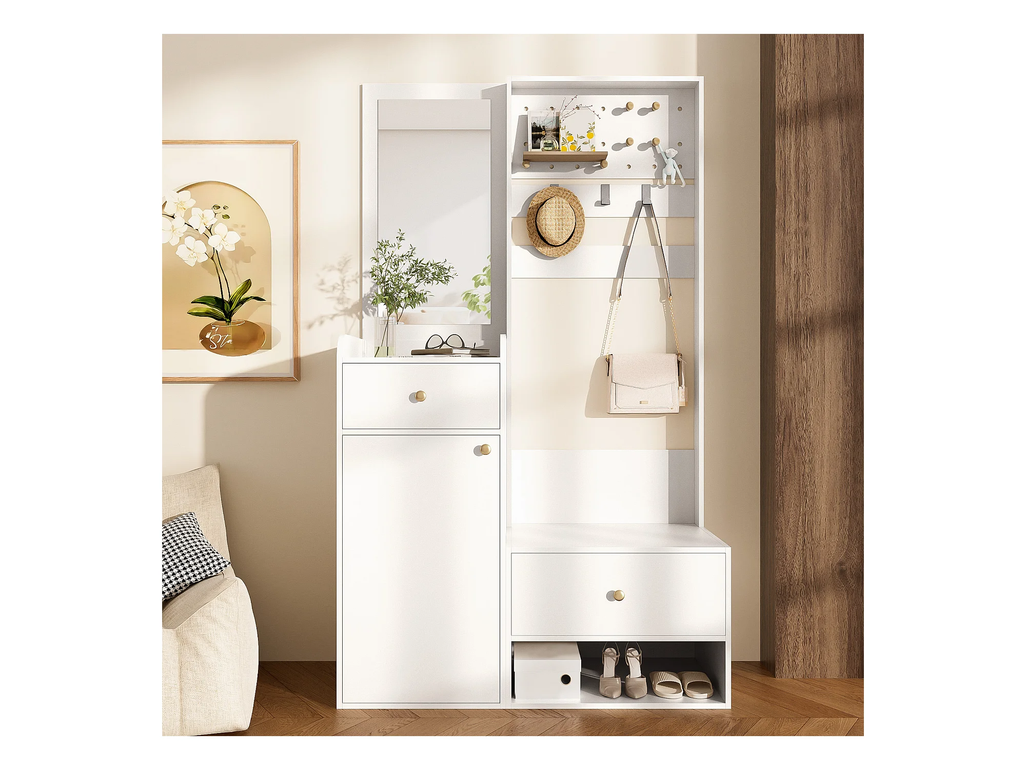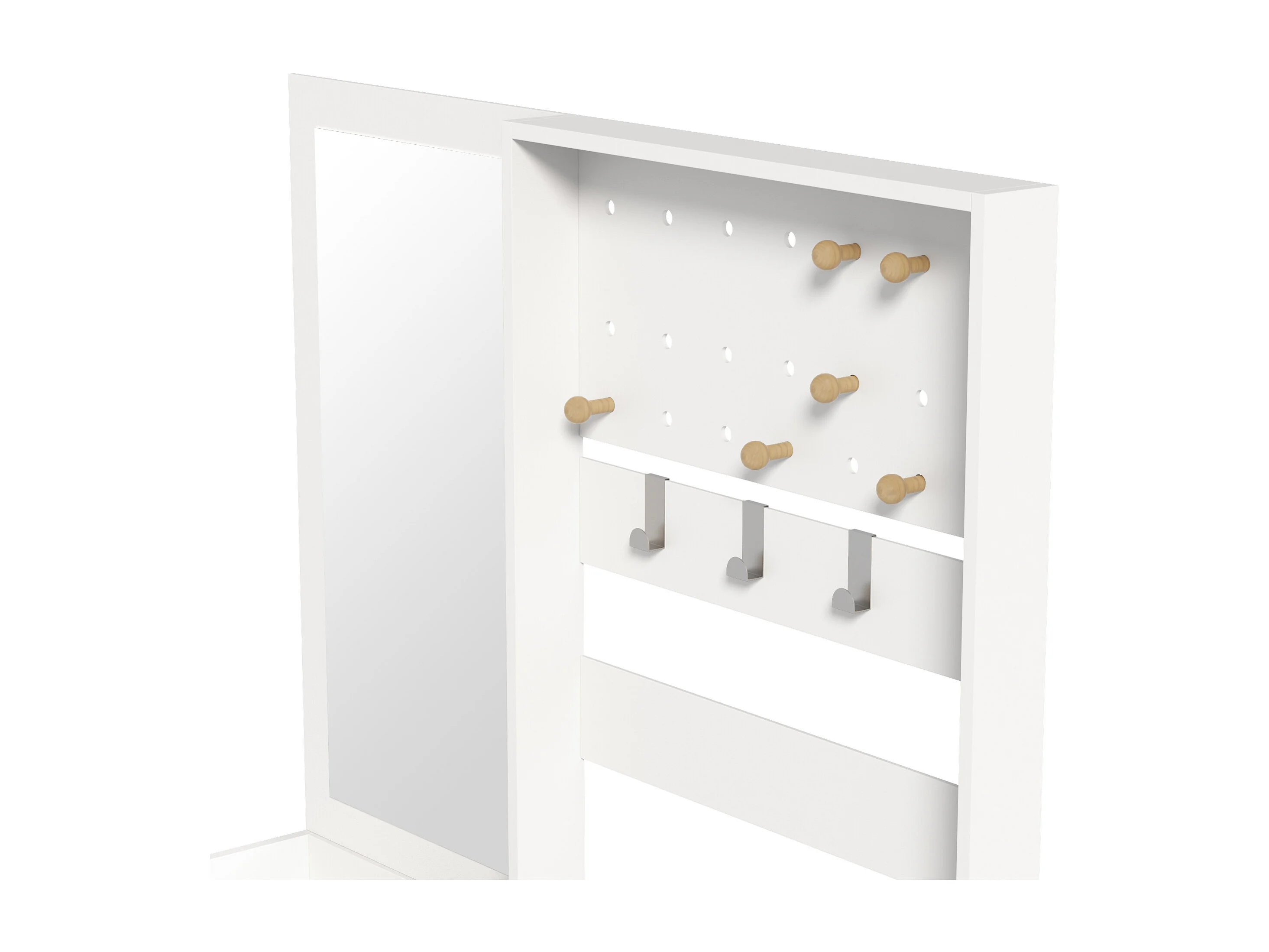 Porte-manteau blanc avec miroir et crochets réglables, 2 tiroirs de rangement - pour l'entrée