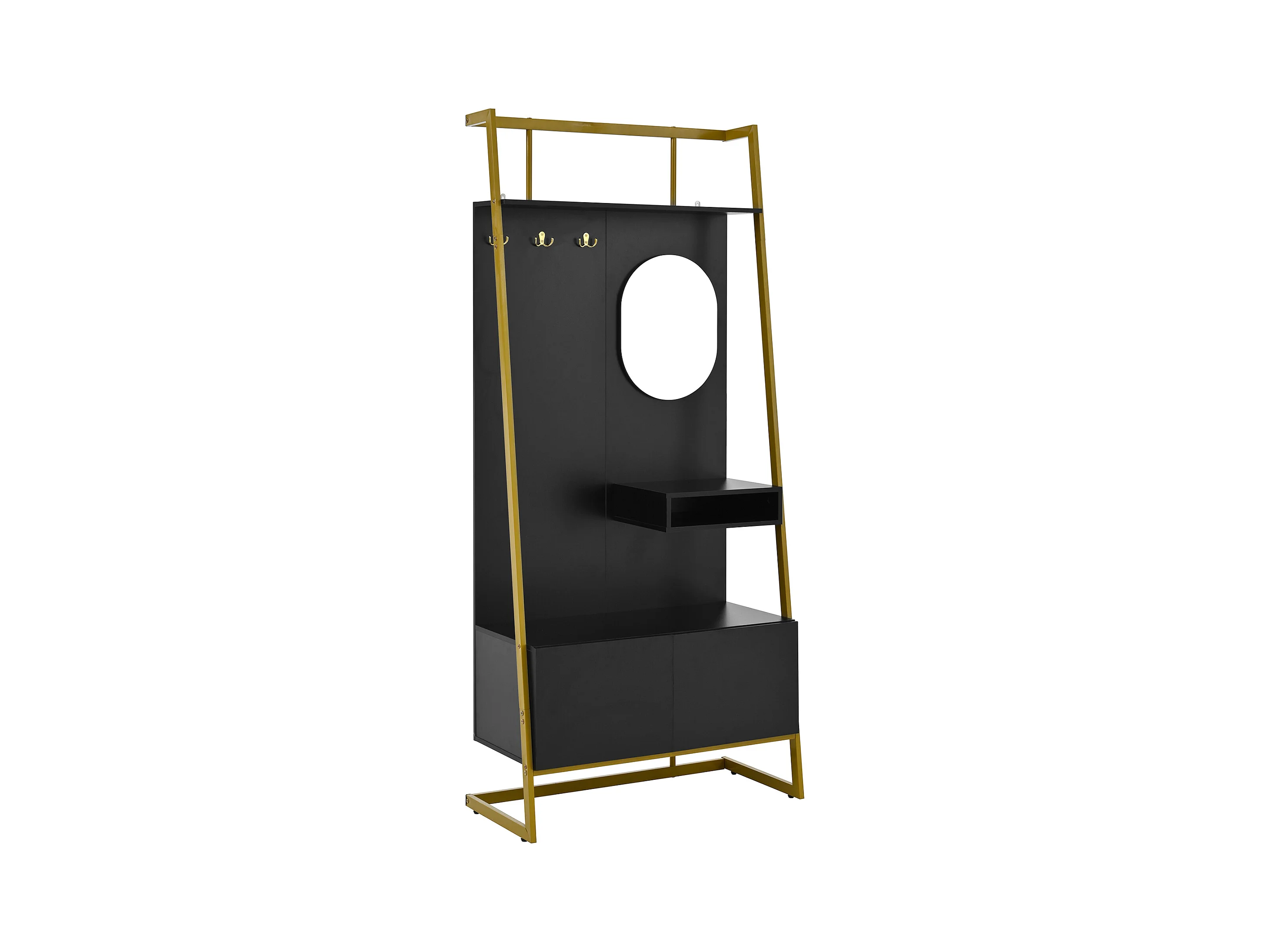 Vestiaire noir - Porte manteau avec 6 crochets dorés et 3 portes - banc de rangement et 3 compartiments ouverts