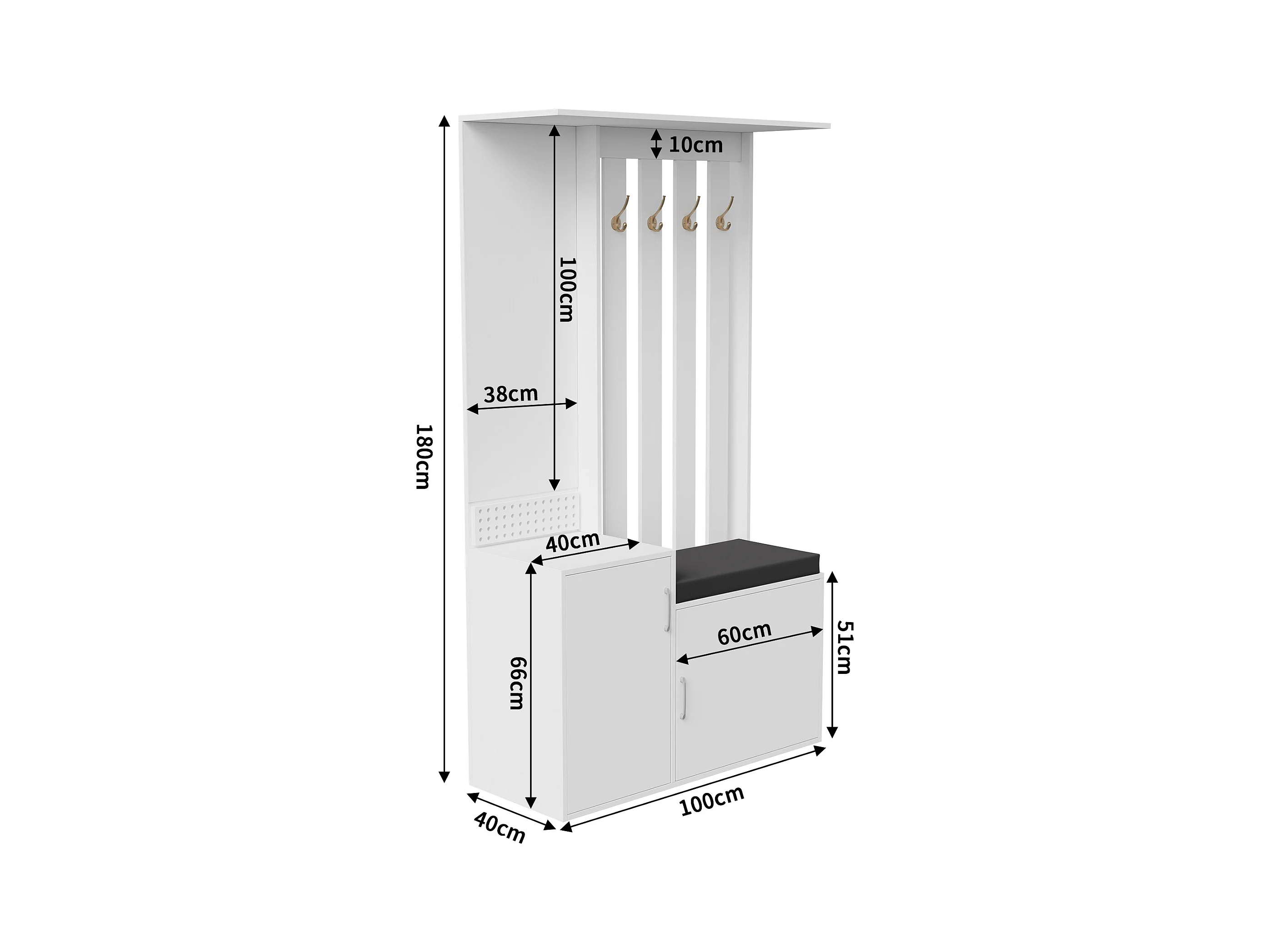 Portemanteau 6 en 1 – Miroir, Banc Rembourré, Étagère à Chaussures, Crochets, Design Moderne Blanc