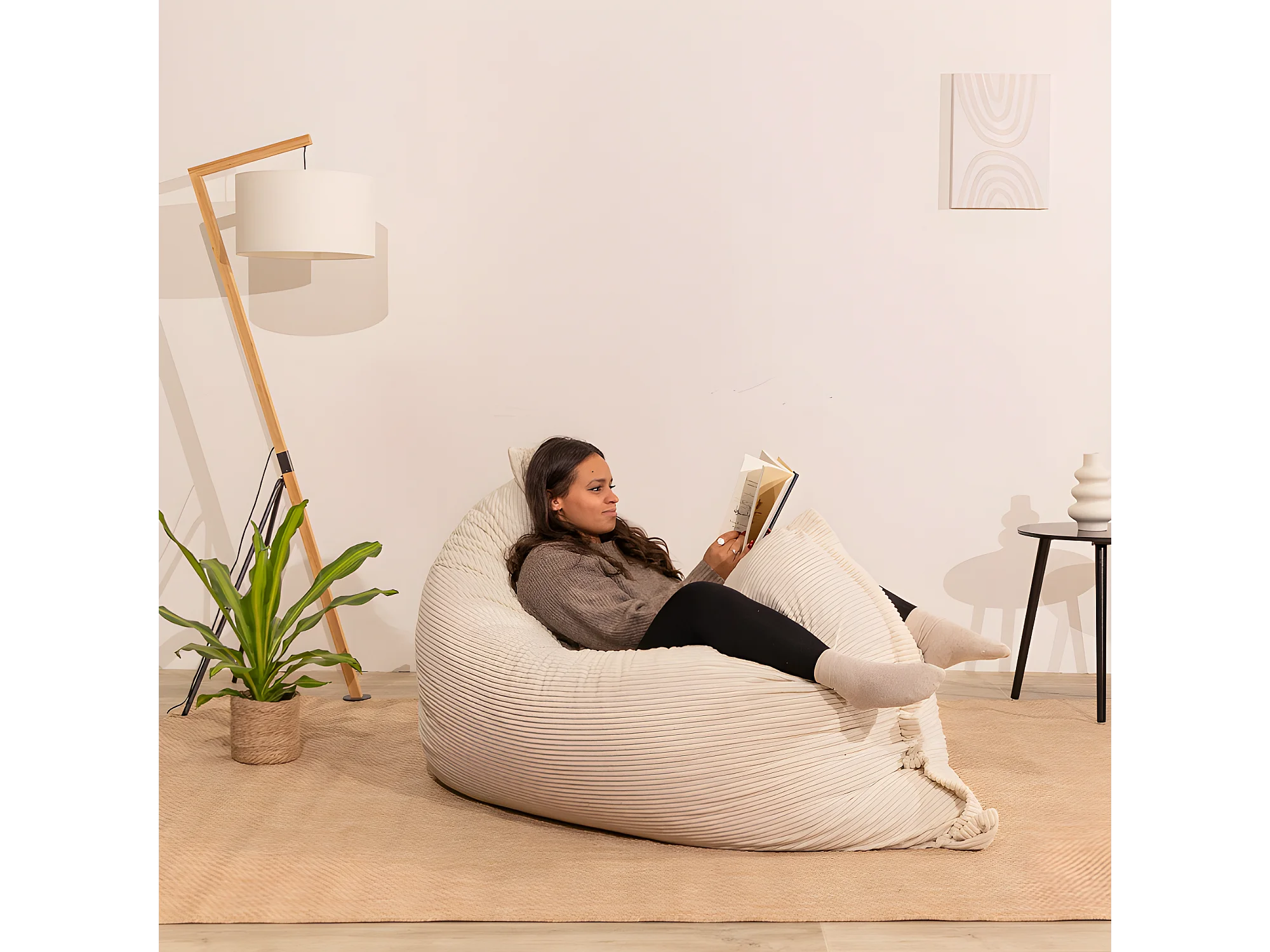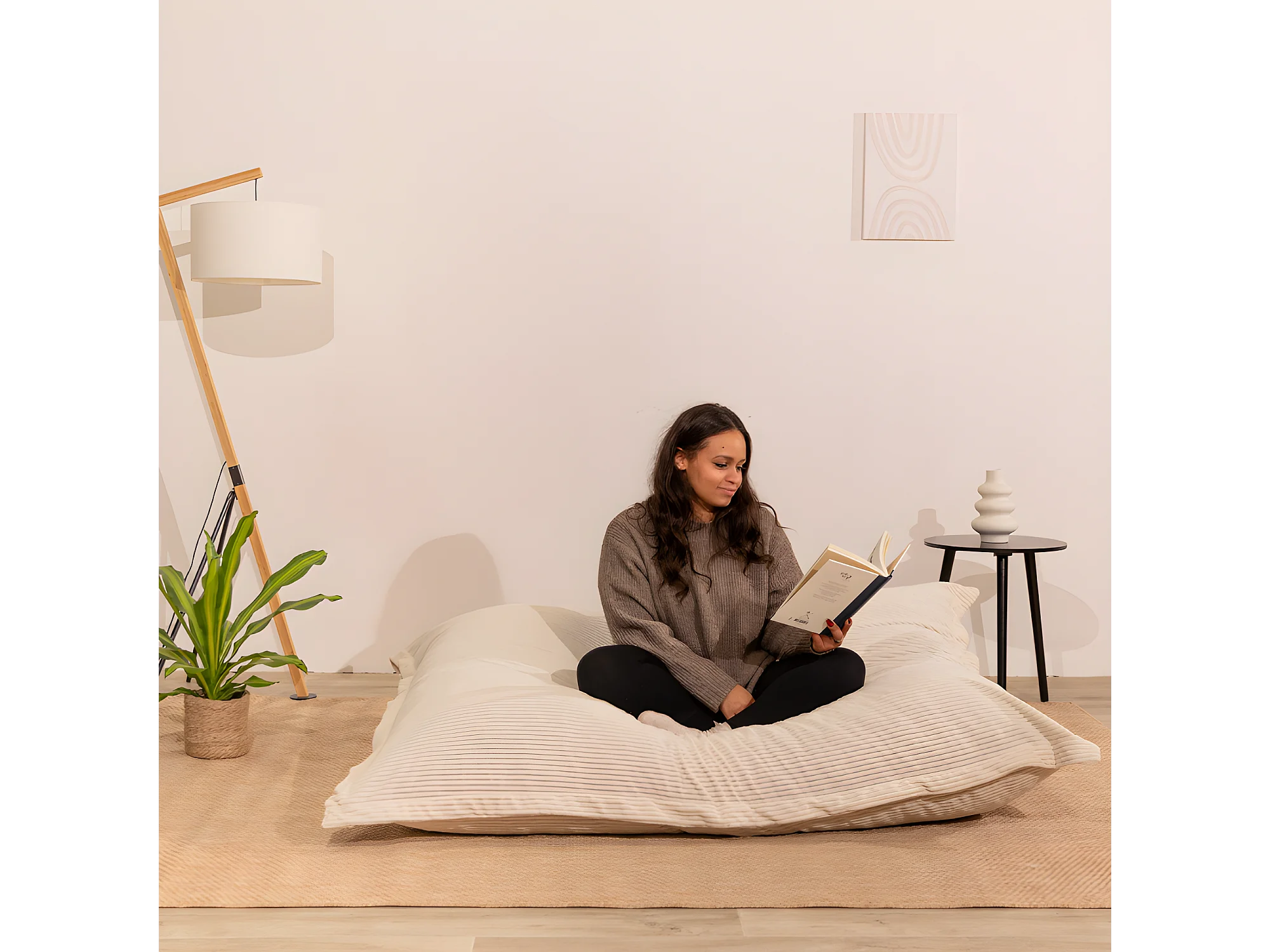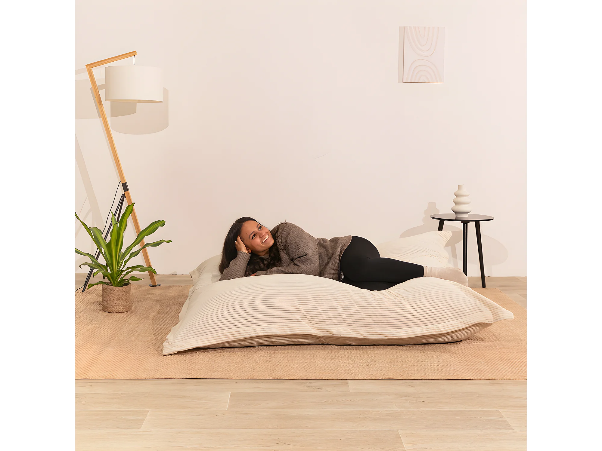Pouf velours côtelé déhoussable blanc cassé 180 x 140 cm