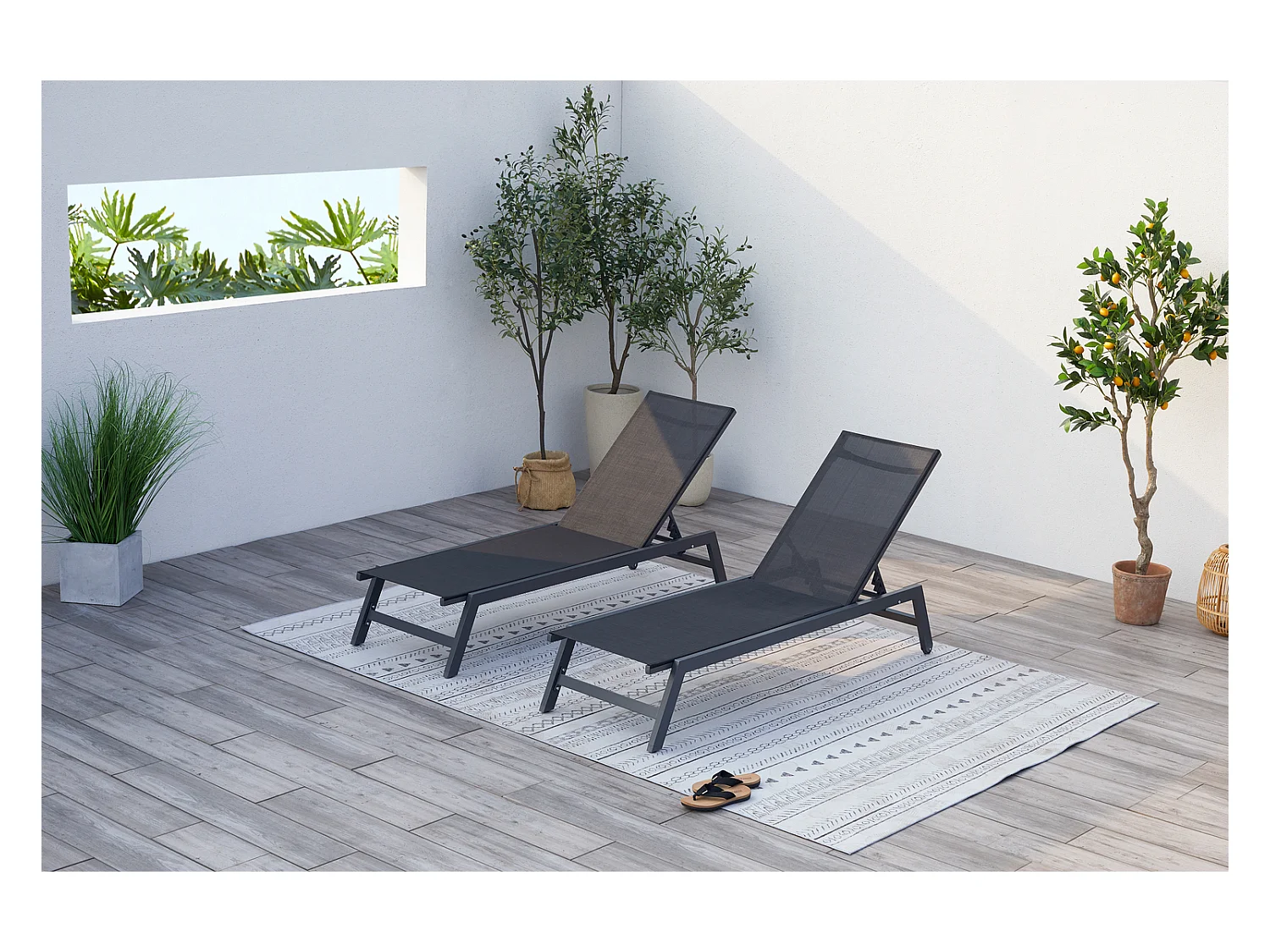 Lot de 2 transats GALAPAGOS en textilène noir - aluminium gris - HAPPY GARDEN