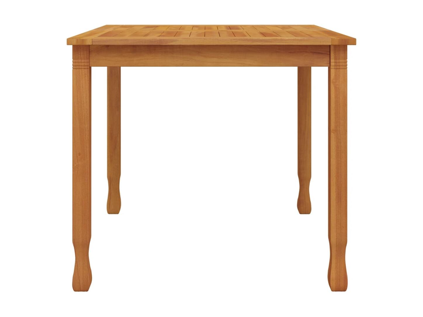 Profitez de votre temps libre avec votre famille et vos amis autour de cette table à manger en bois ! Bois de teck massif : le bois de teck massif est un matériau naturel magnifique. Il a été chevronné, séché au four, puis sablé finement pour lui donner une apparence très lisse. Le bois de teck est connu pour sa résistance exceptionnelle et sa résistance aux intempéries.Cadre stable et robuste : le cadre en bois de la table assure robustesse et stabilité.Dessus de table spacieux : la table à manger en bois vous offre un dessus de table spacieux. Vous pouvez placer vos collations, boissons et n'importe laquelle de vos décorations préférées.Nombreuses applications : la table à manger a un design intemporel et s'adapte à presque tous les décors. Vous pouvez la placer dans votre maison ou dans n'importe quel patio commercial, jardin, balcon, etc. Remarque : Pour que vos meubles d'extérieur restent beaux, nous vous recommandons de les protéger avec une housse imperméable. Bon à savoir :Pour faciliter au maximum le montage, chaque produit est livré avec des instructions.