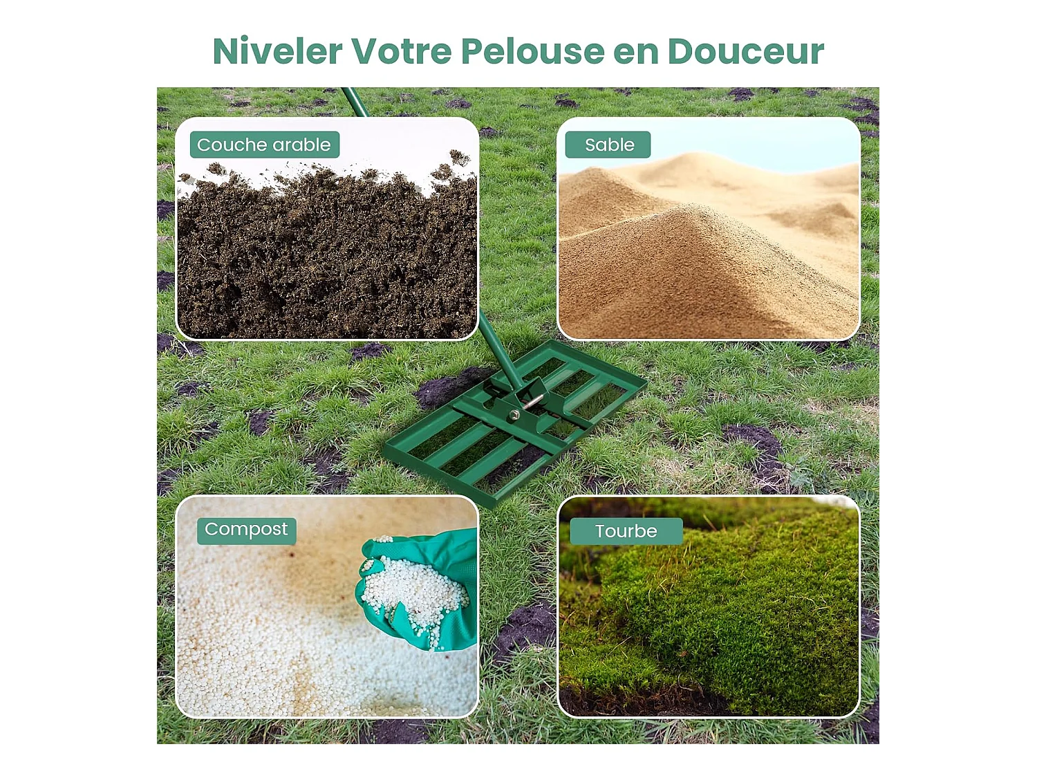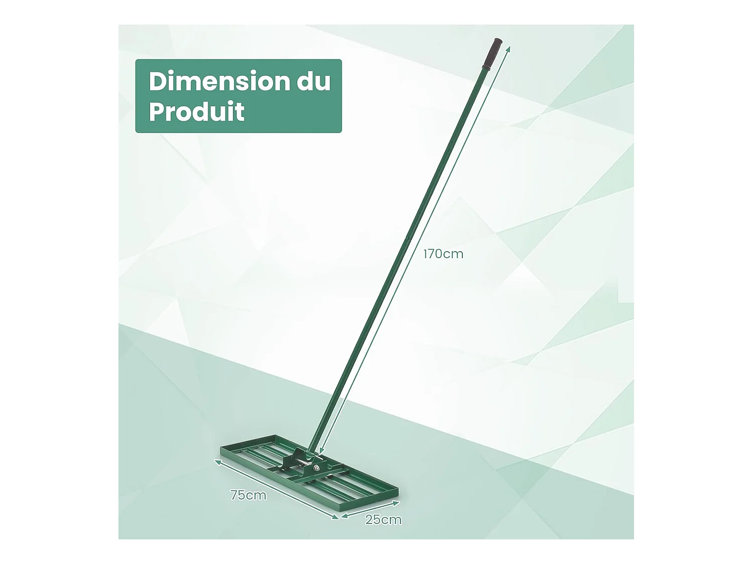 Râteau de Nivellement de Pelouse 75 x 25 cm, Râteau de Jardin en Métal avec Poignée Ergonomique, Outil de Niveau de Pelouse pour Jardin CourTerrain de Golf Ferme
