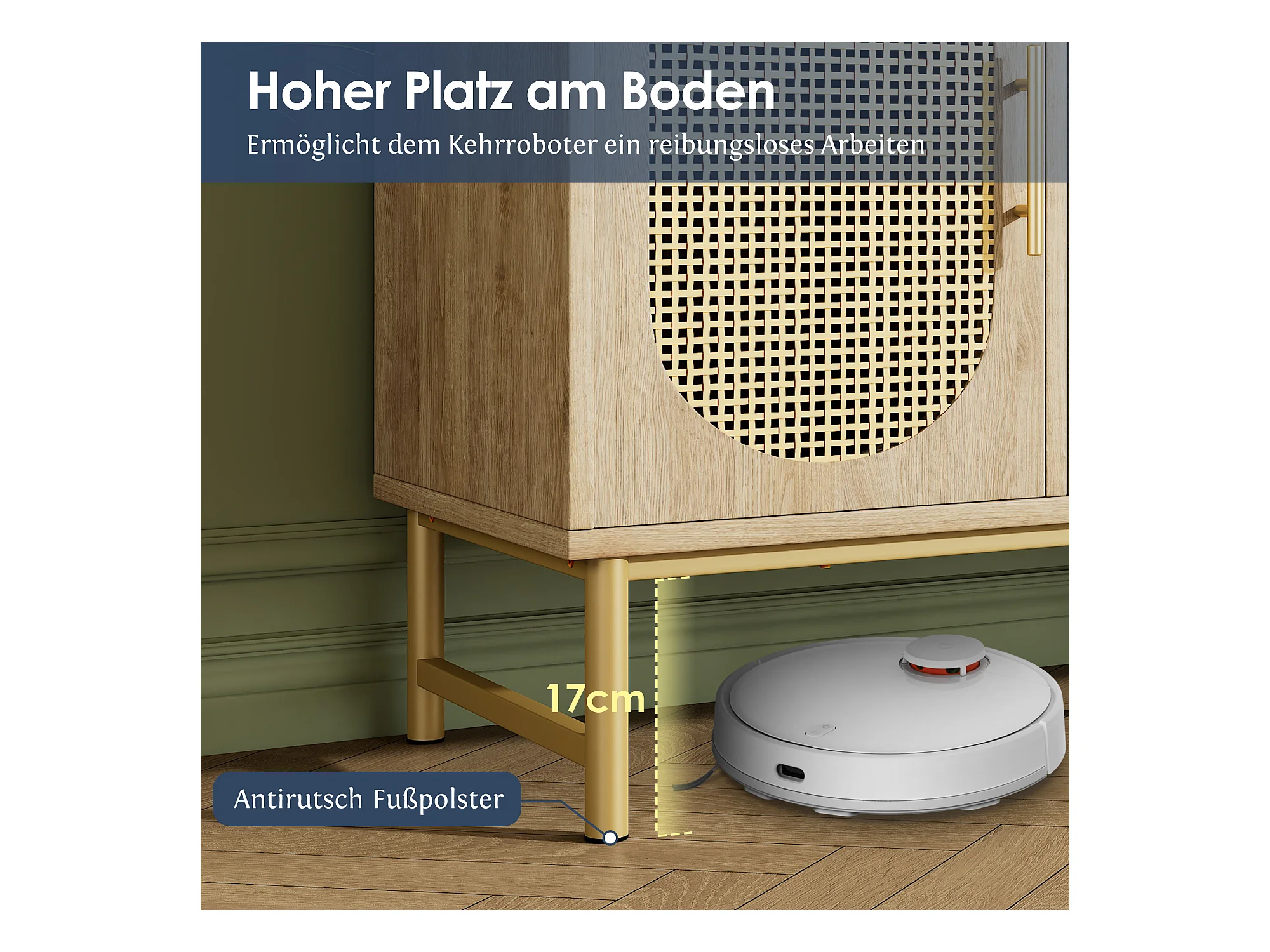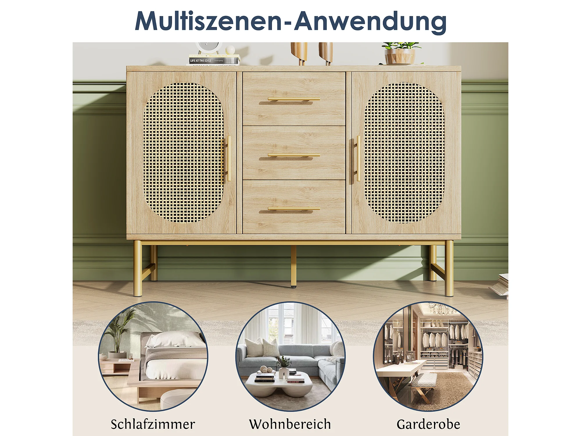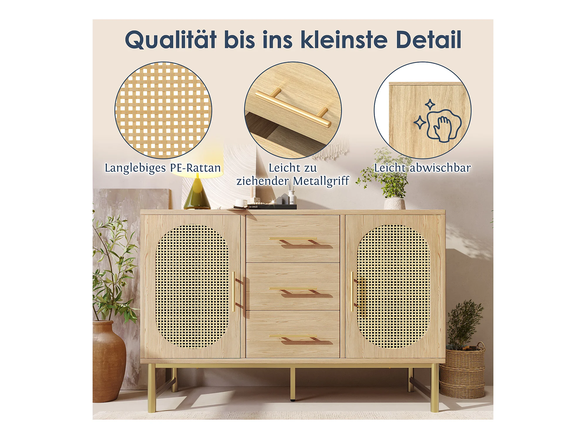 Rattan Buffet, 3 tiroirs et 2 portes en rattan, design moderne, bois, blanc, avec étagères réglables (120x40x74 cm)