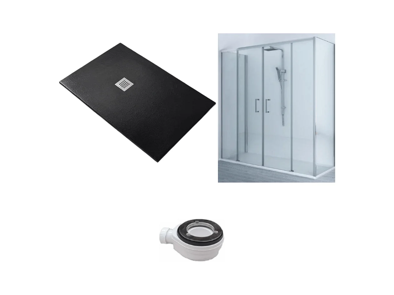 Receveur de Douche 80X150 cm Ligne Vulcano Extra Slim Noir + Cabine de Douche 80x150 cm Haut 200 cm Avec Un Verre Fixe et Ouverture Centrale avec 4 Cristaux