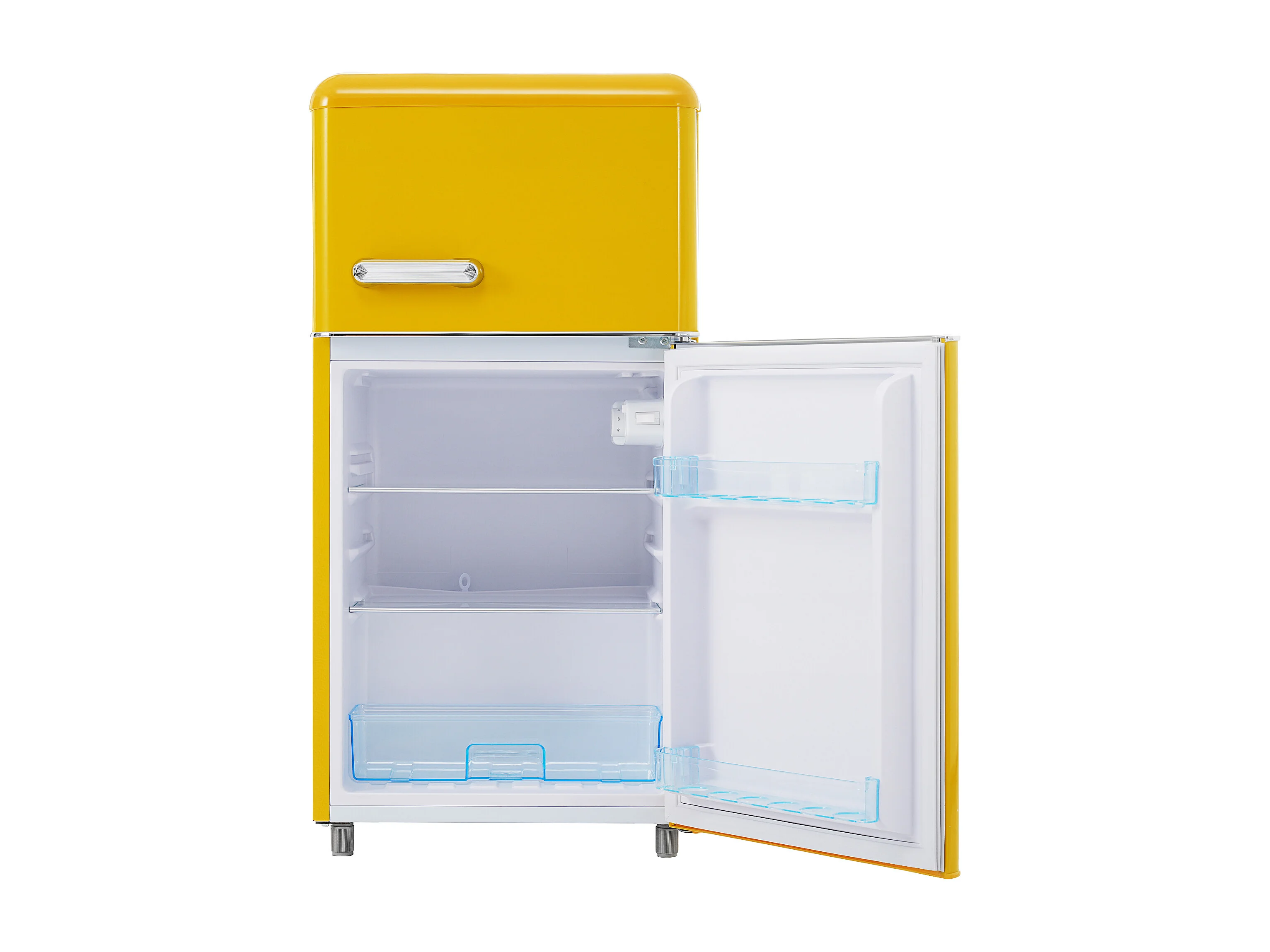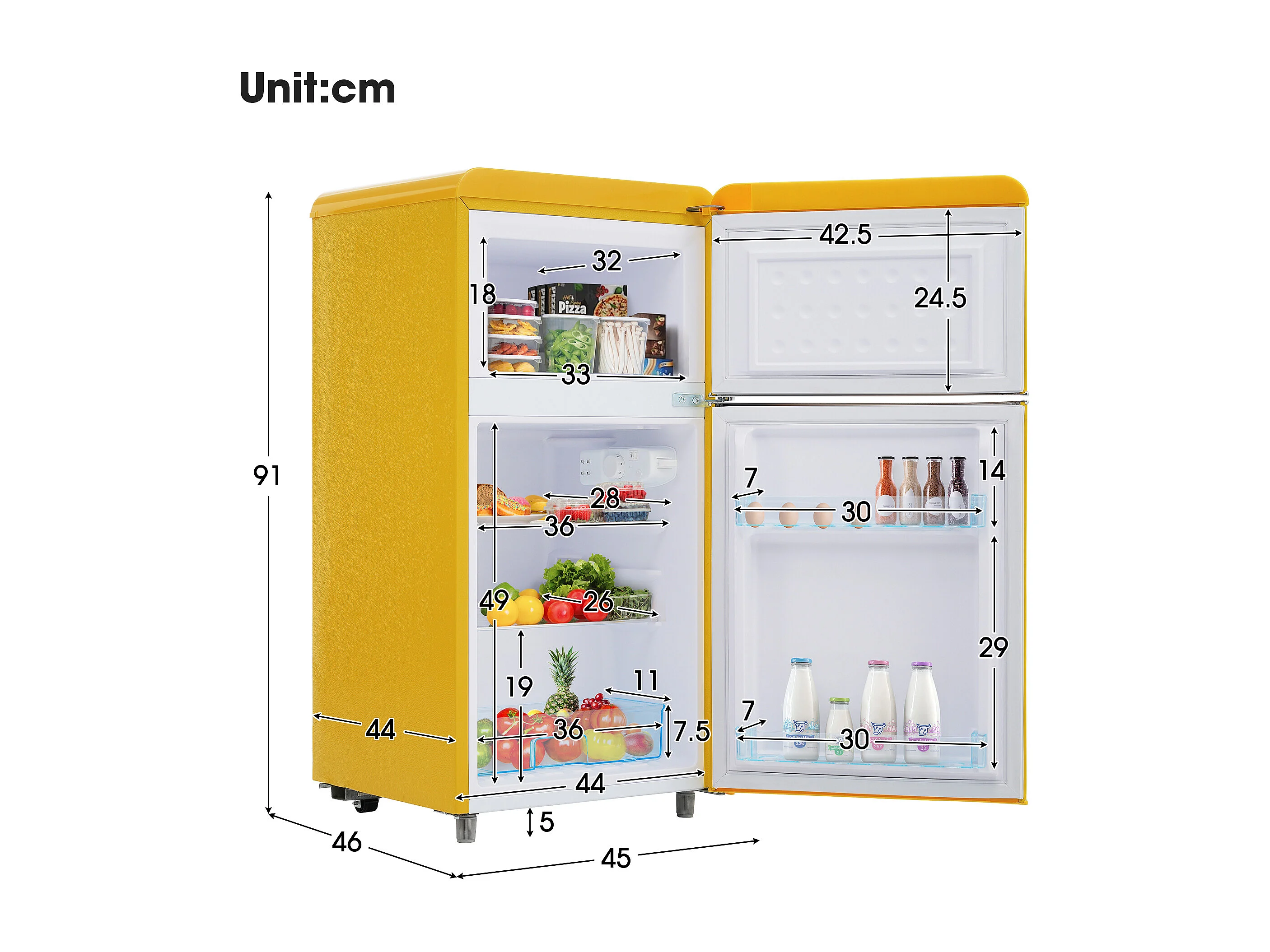 Réfrigérateur 46x45x91 cm, 72 L dont 21 L congélateur, étagères réglables, thermostat, fer plastique jaune