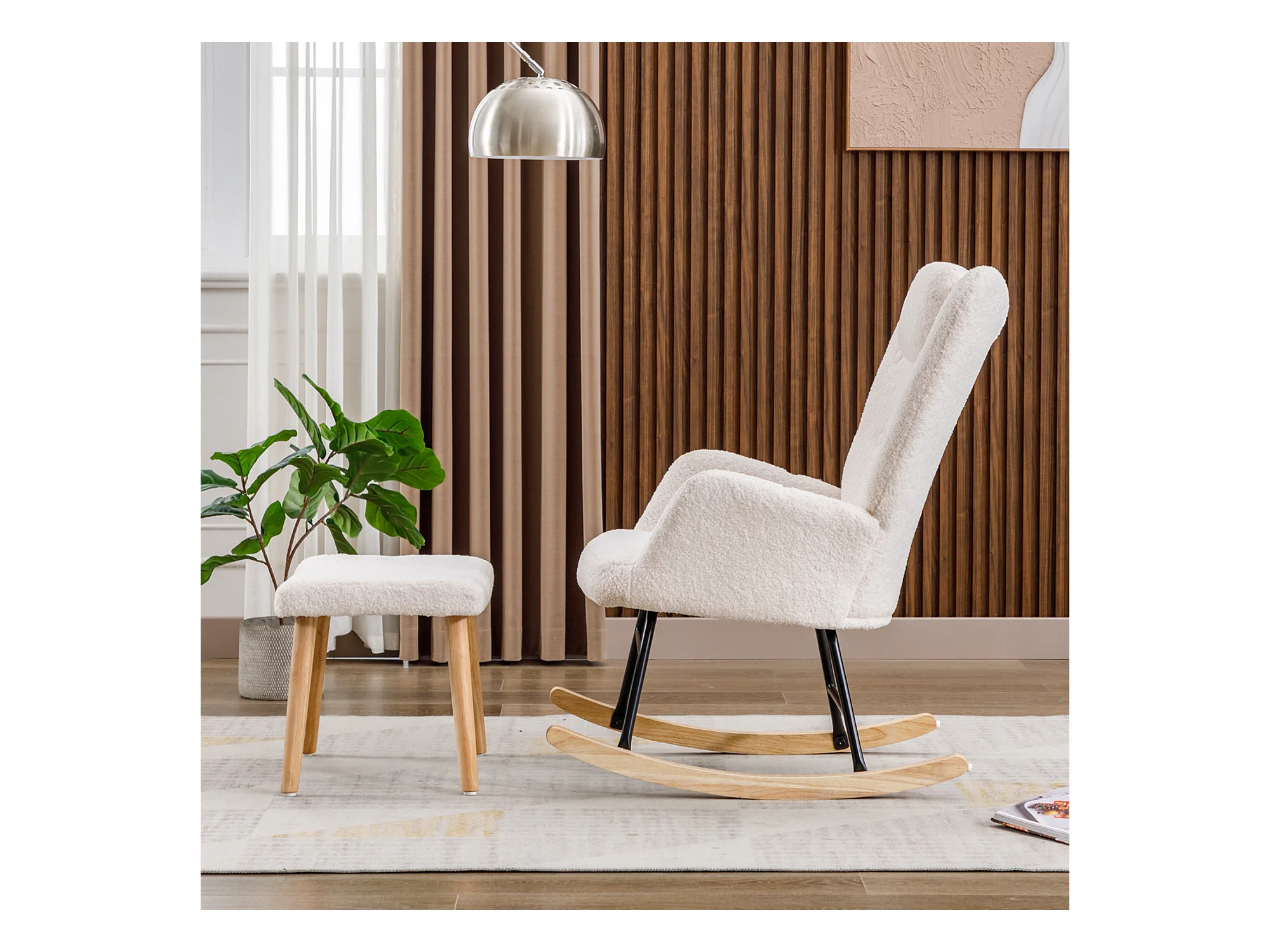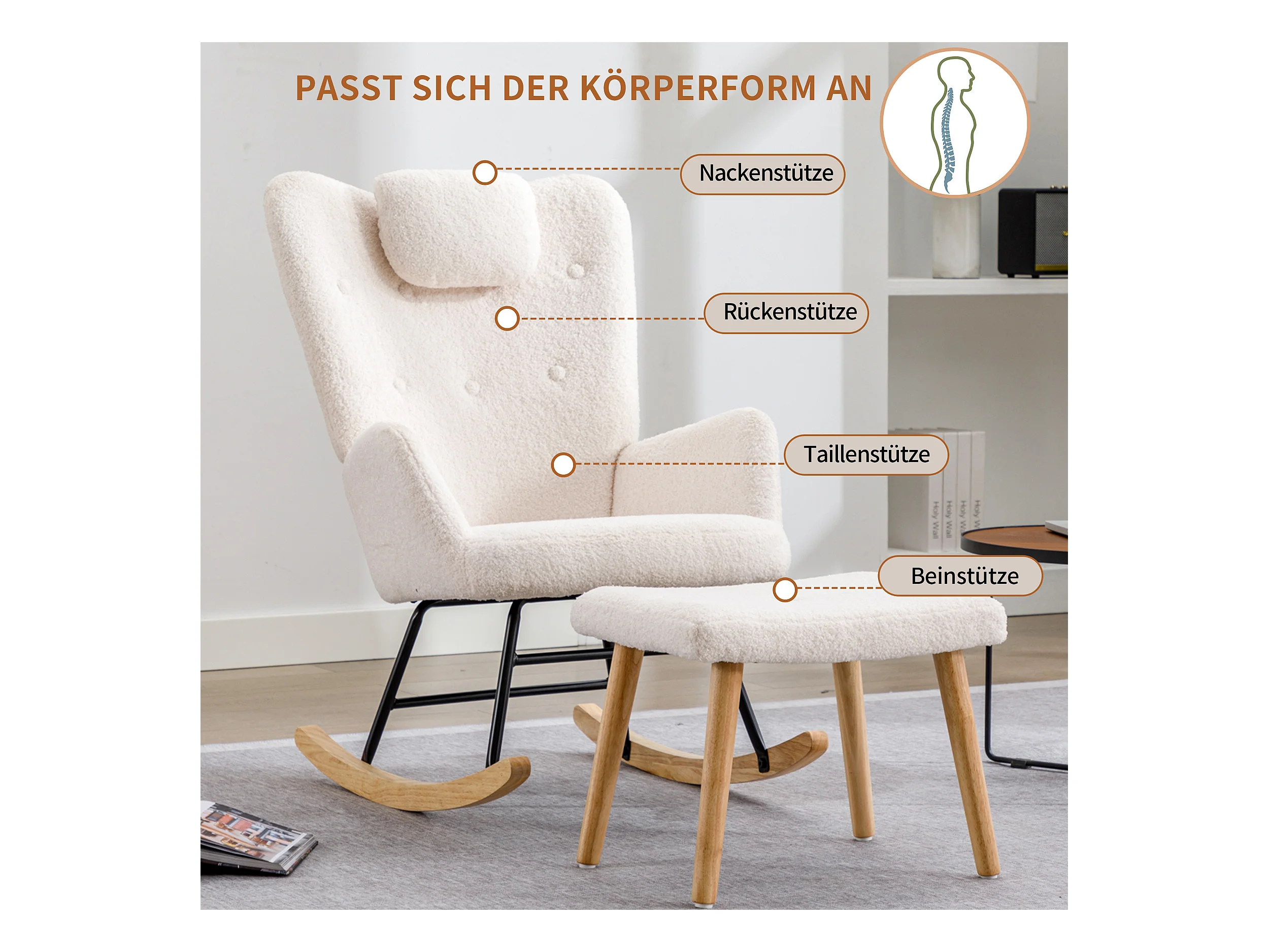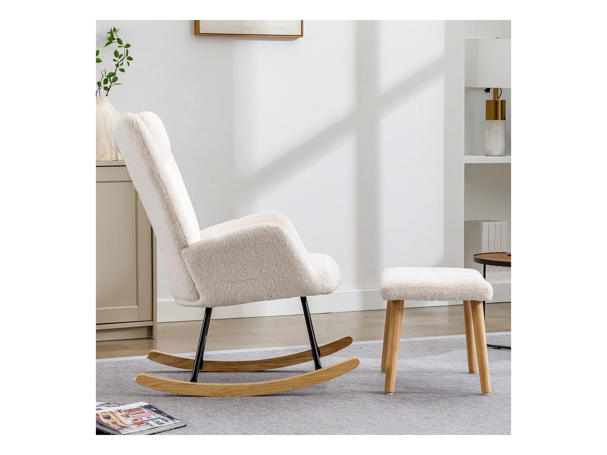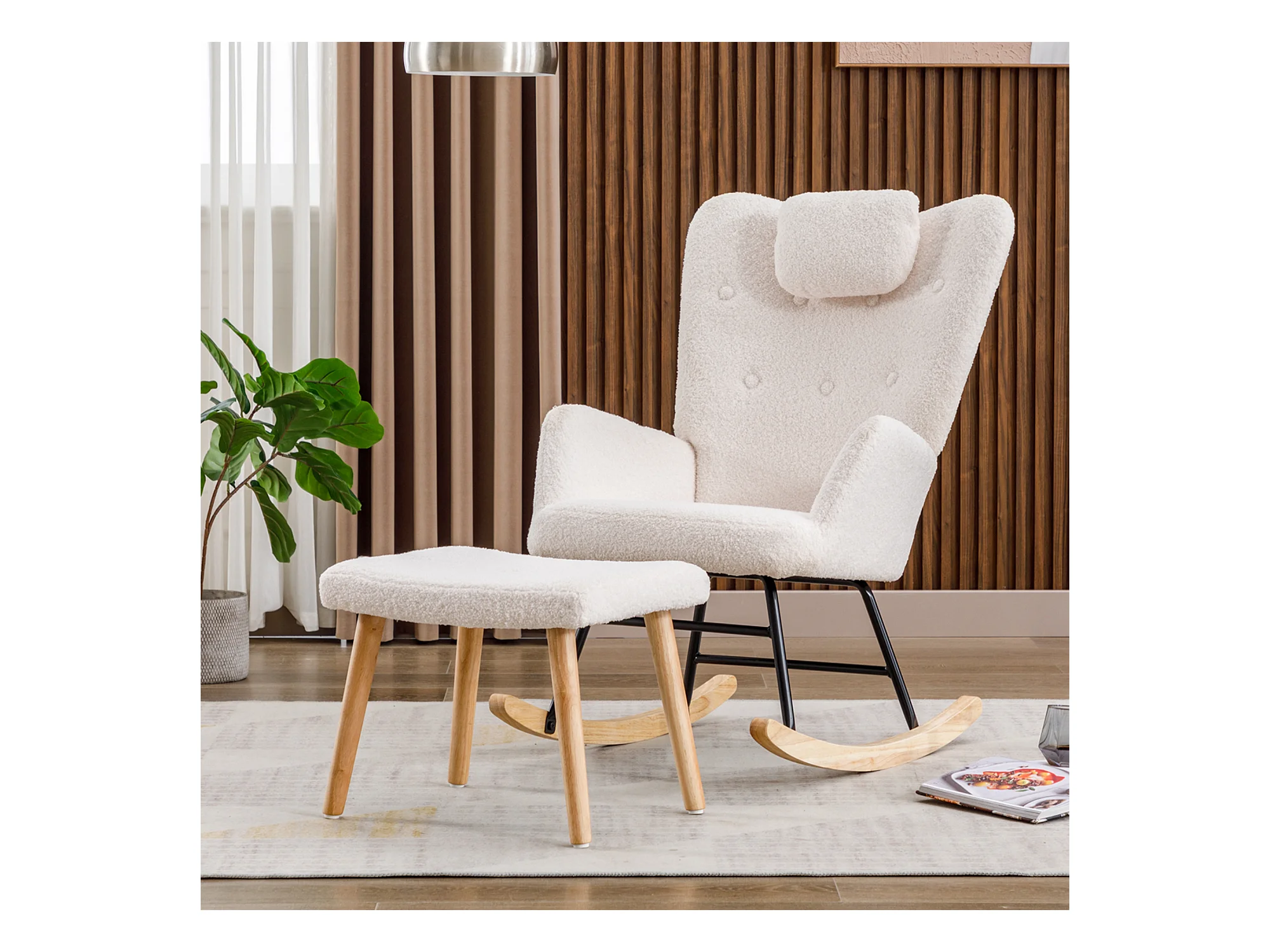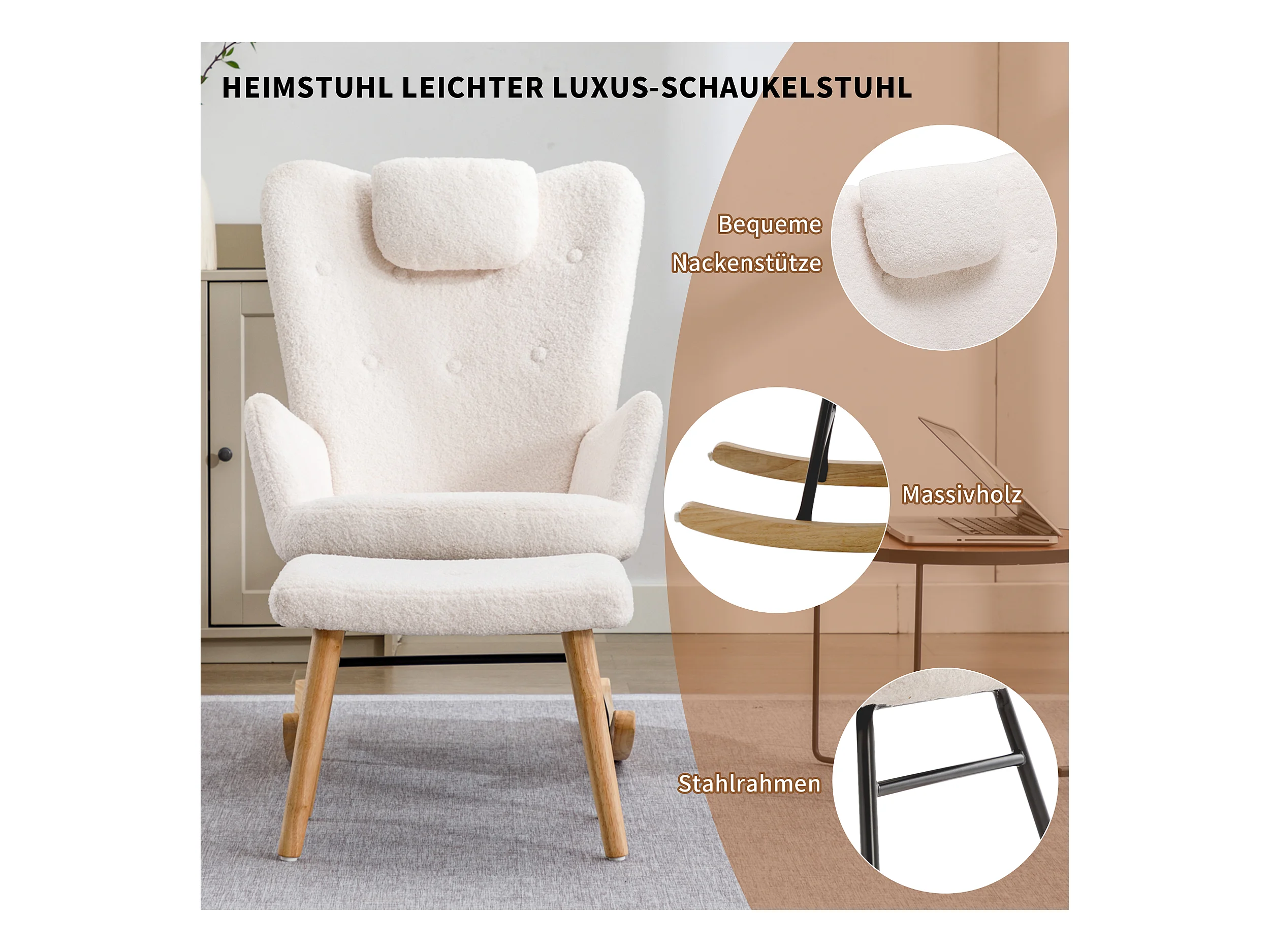 Rocking-chair confortable blanc en teddy peluche, avec appui-tête et repose-pieds, tissu, blanc (65x82x94 cm)