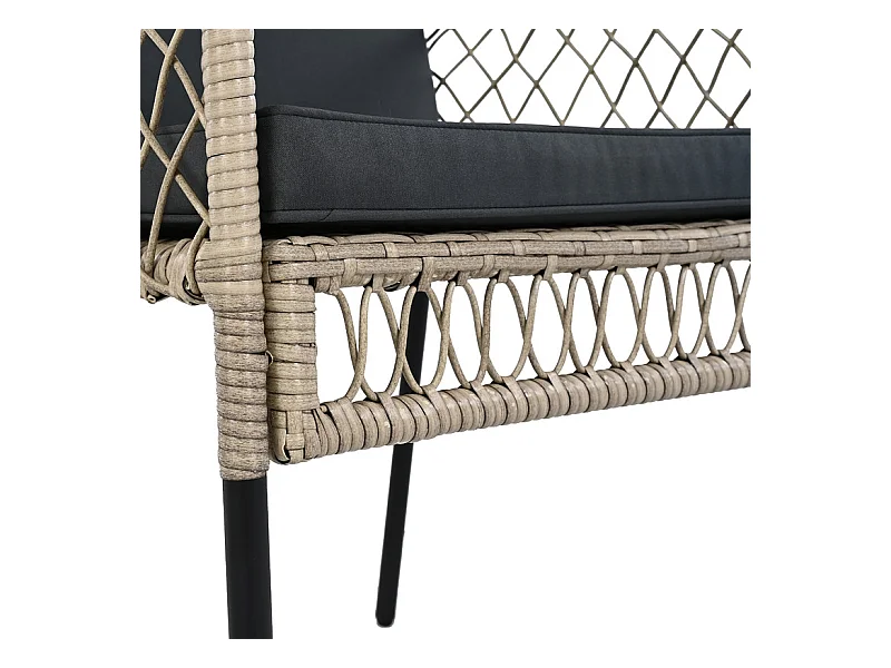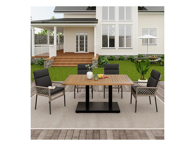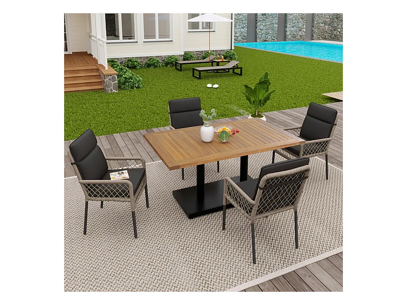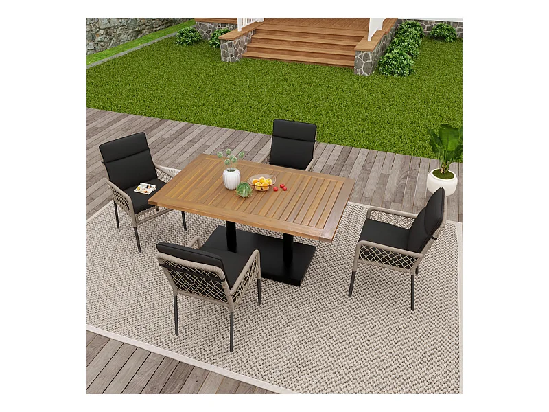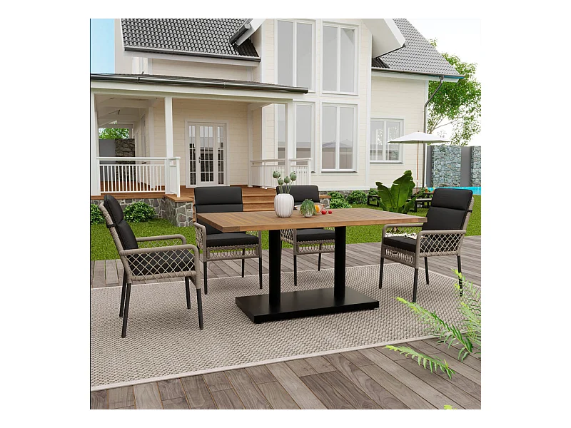 Salle à manger de jardin en fer galvanisé et bois : une table L.120 cm et 4 fauteuils avec coussin