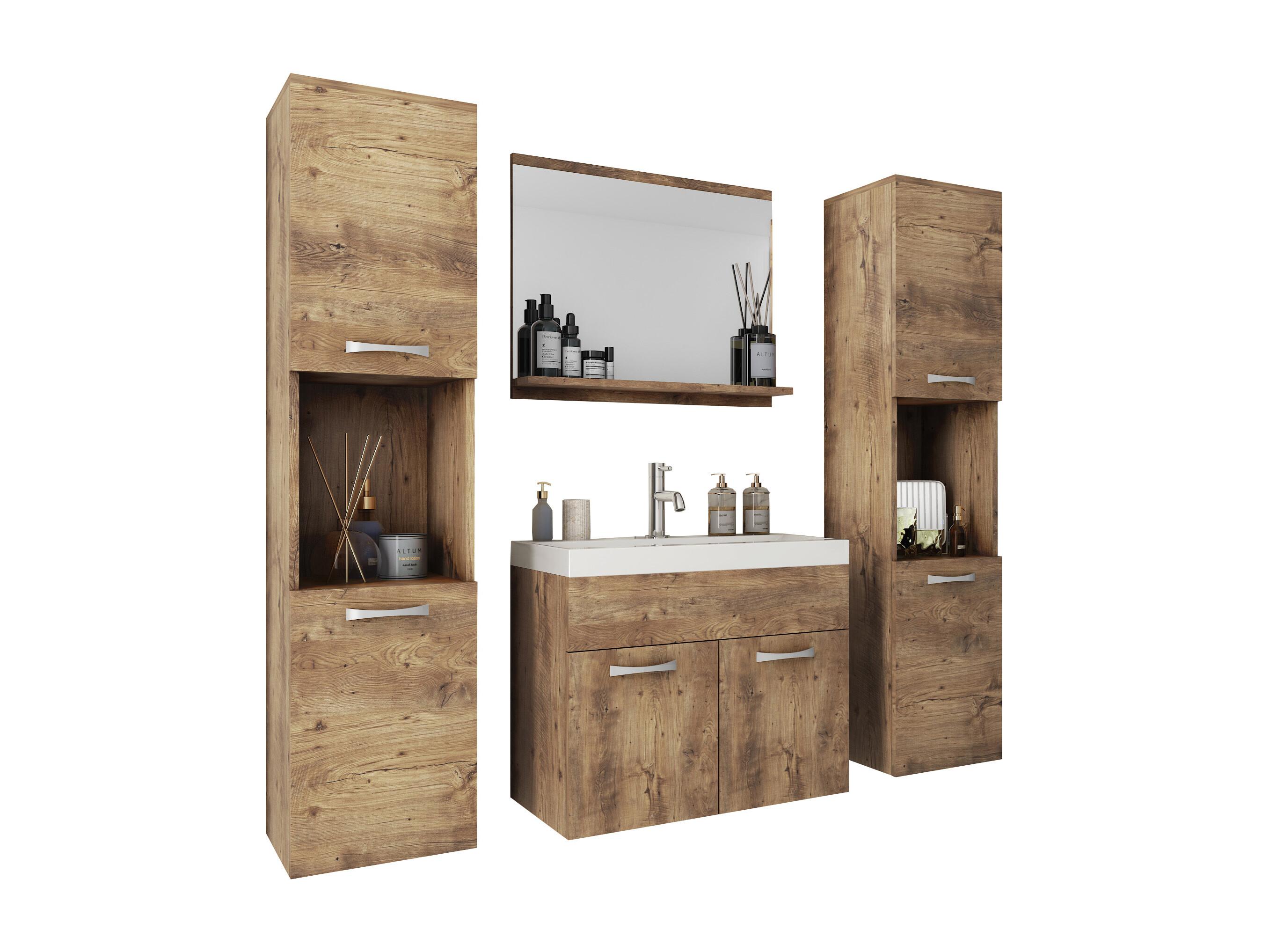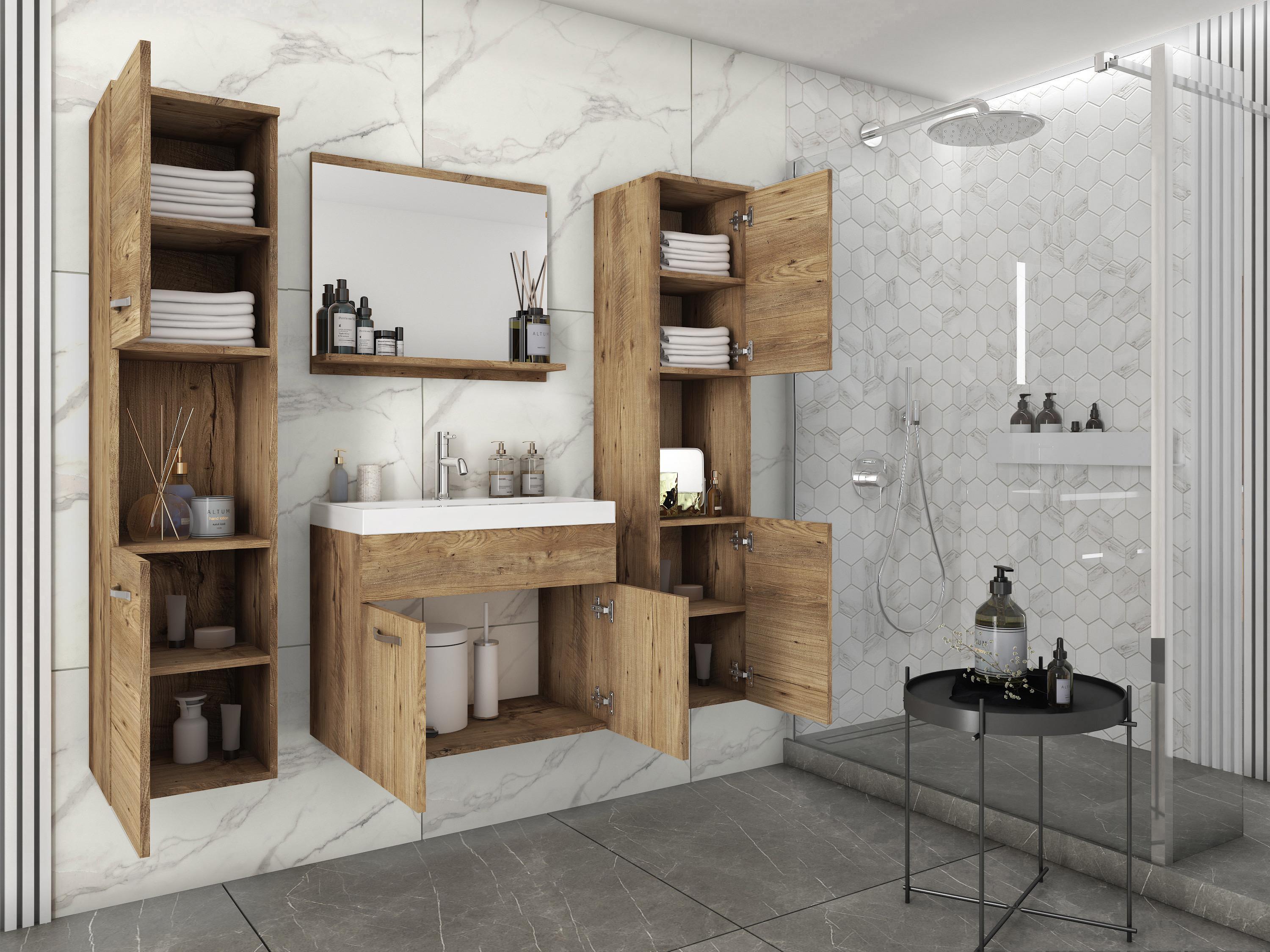 Ensemble de salle de bain, meubles suspendus avec lavabo, 2 colonnes et miroir avec étagères, chêne artisan mat