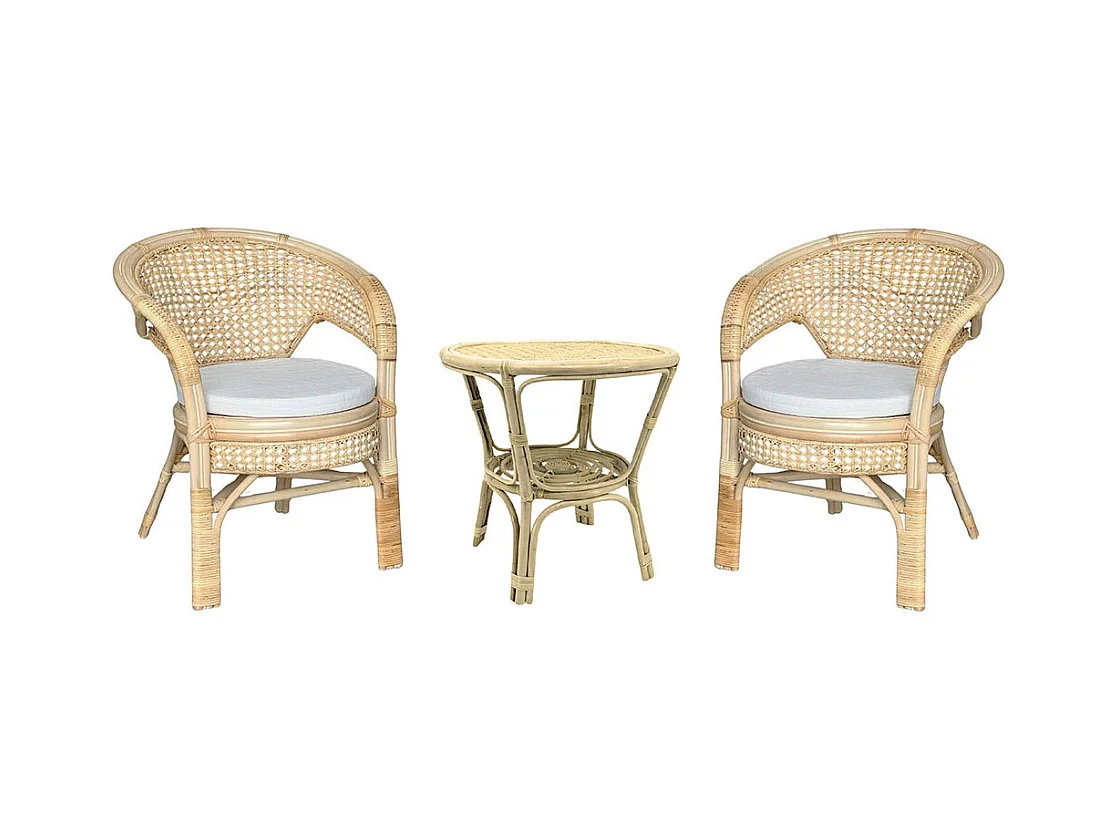 Salon Mandola en bois de bambou et paille de Vienne avec 2 fauteuils et 1 table basse
