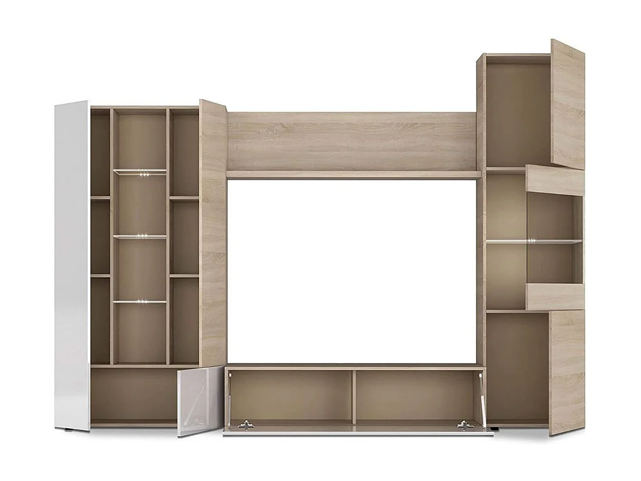 Meuble TV LED Blanc Brillant et Chêne - Salon Moderne 260 cm