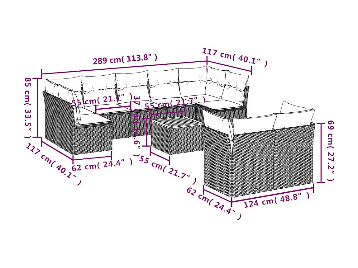 Salon de jardin 10 pcs avec coussins gris résine tressée