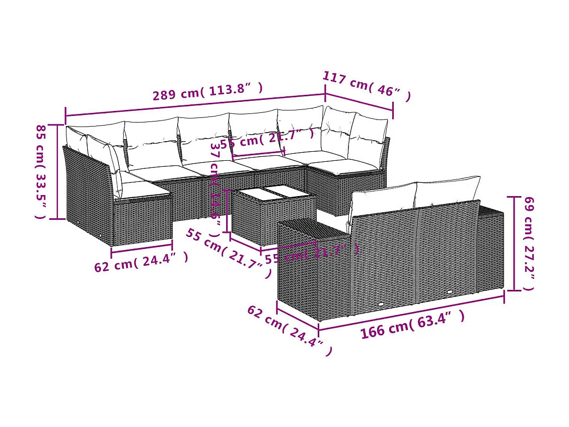 Salon de jardin 10 pcs avec coussins marron résine tressée