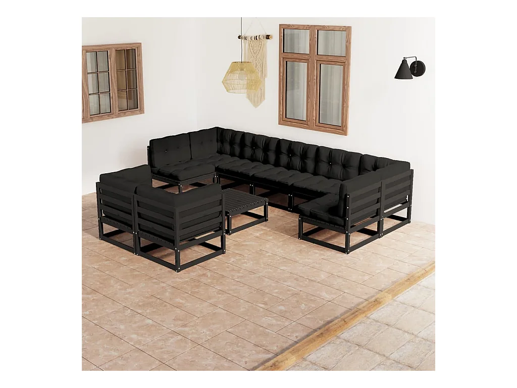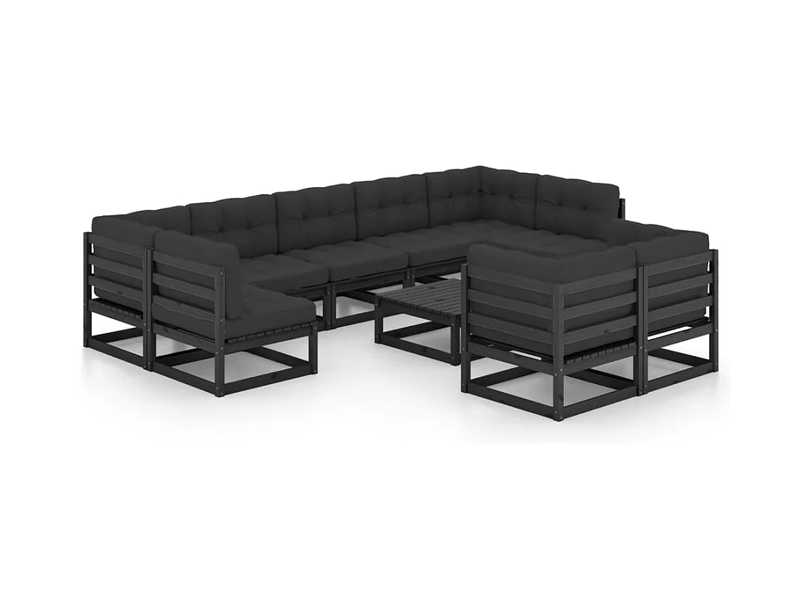 Salon de jardin 10 pcs avec coussins Noir Bois de pin massif