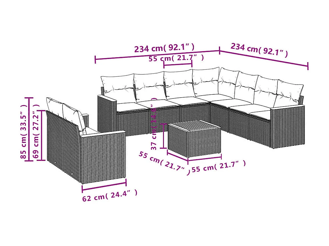 Salon de jardin 10 pcs avec coussins noir résine tressée