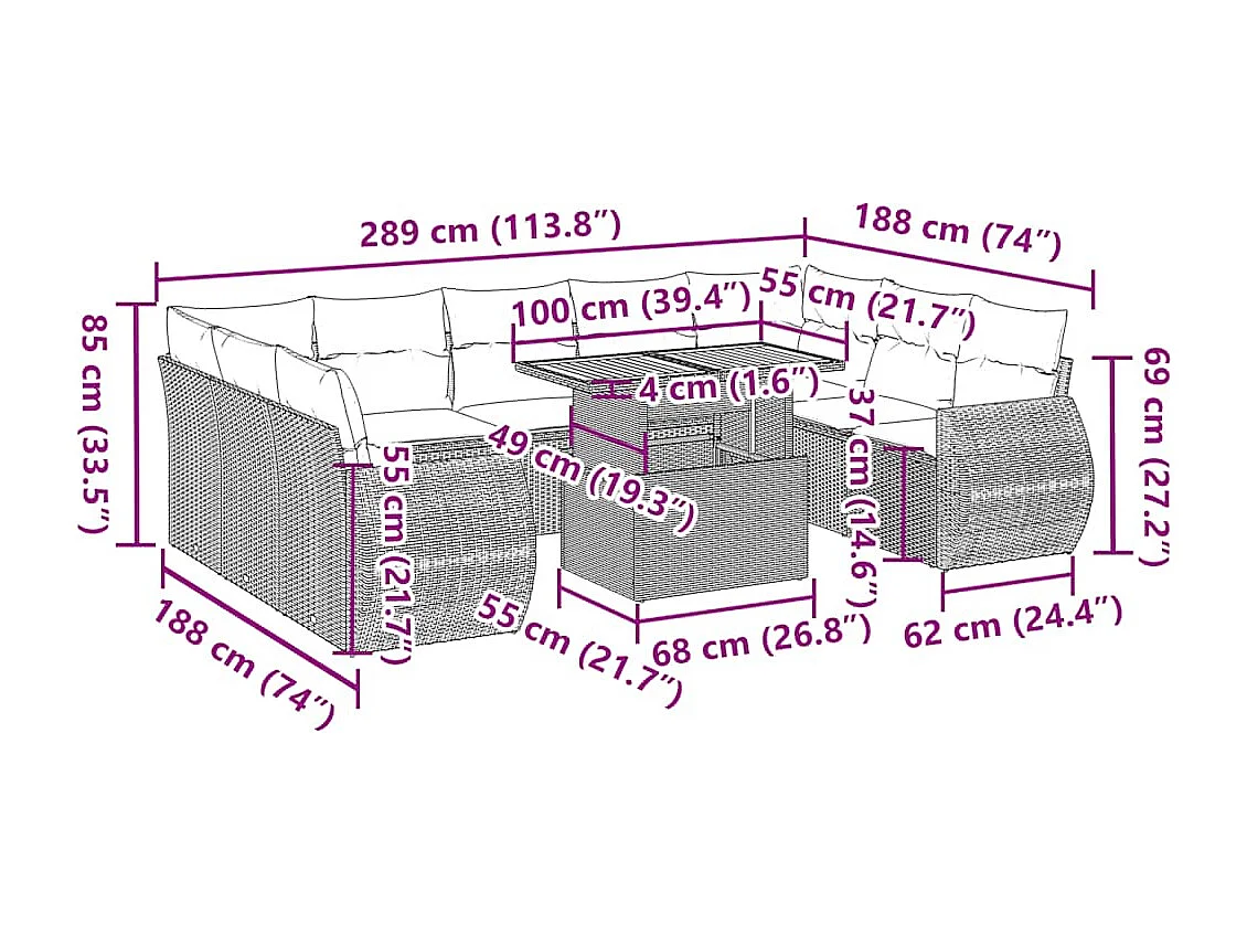 Salon de jardin 10 pcs avec coussins noir résine tressée